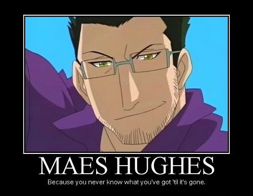 Hughes es realmente una imagen perfecta de un pozo de felicidad que se está secando. El Coronel Mustang, Edward y la mayoría de sus colegas estaban constantemente molestos con él, siempre adorando a su esposa e hija, pero terminó dejando a todos los que lo rodeaban con una profunda tristeza a su paso.