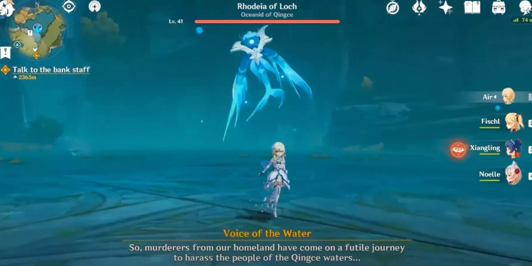 La oceánida, en lugar de luchar ella misma, invoca a los hidromímicos para que luchen en su nombre. Cuando estos Hidro Mímicos son derrotados, ella pierde su HP. Los Mímicos son bastante fáciles de derrotar si los jugadores llevan personajes Cryo con ellos. Los mejores personajes para este combate son Chongyun, Ayaka, Ganyu y Diona. Los jugadores no deberían molestarse en llevar a personajes Hidro como Childe o Mona porque los Mímicos son inmunes a los ataques Hidro.