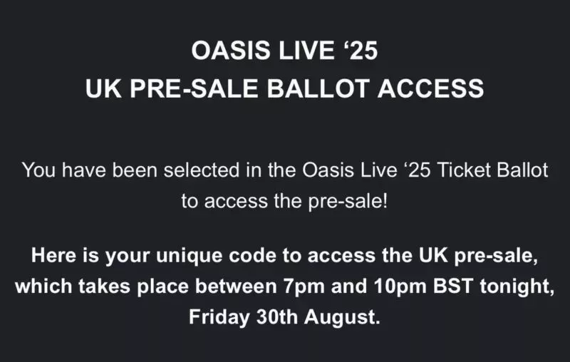 "Has sido seleccionado en la votación de Oasis Live '25 Ticket para acceder a la preventa", reza un mensaje enviado a algunos afortunados fans que completaron la entrada de la votación a principios de esta semana. "Aquí tienes tu código único para acceder a la preventa en el Reino Unido, que tendrá lugar entre las 19:00 y las 22:00 horas de esta noche".