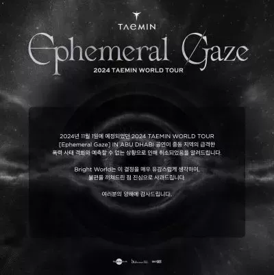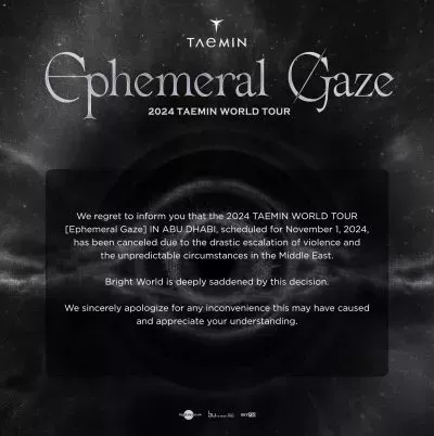 La fecha de Abu Dhabi de la gira mundial en solitario 'Ephemeral Gaze' 2024 del cantante de SHINee Taemin ha sido cancelada.