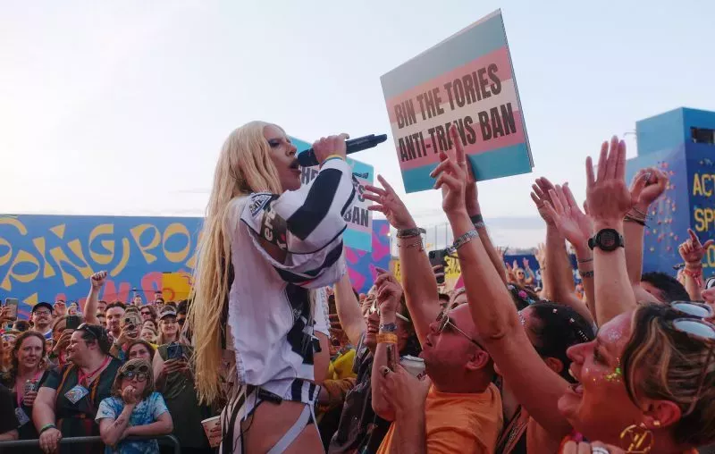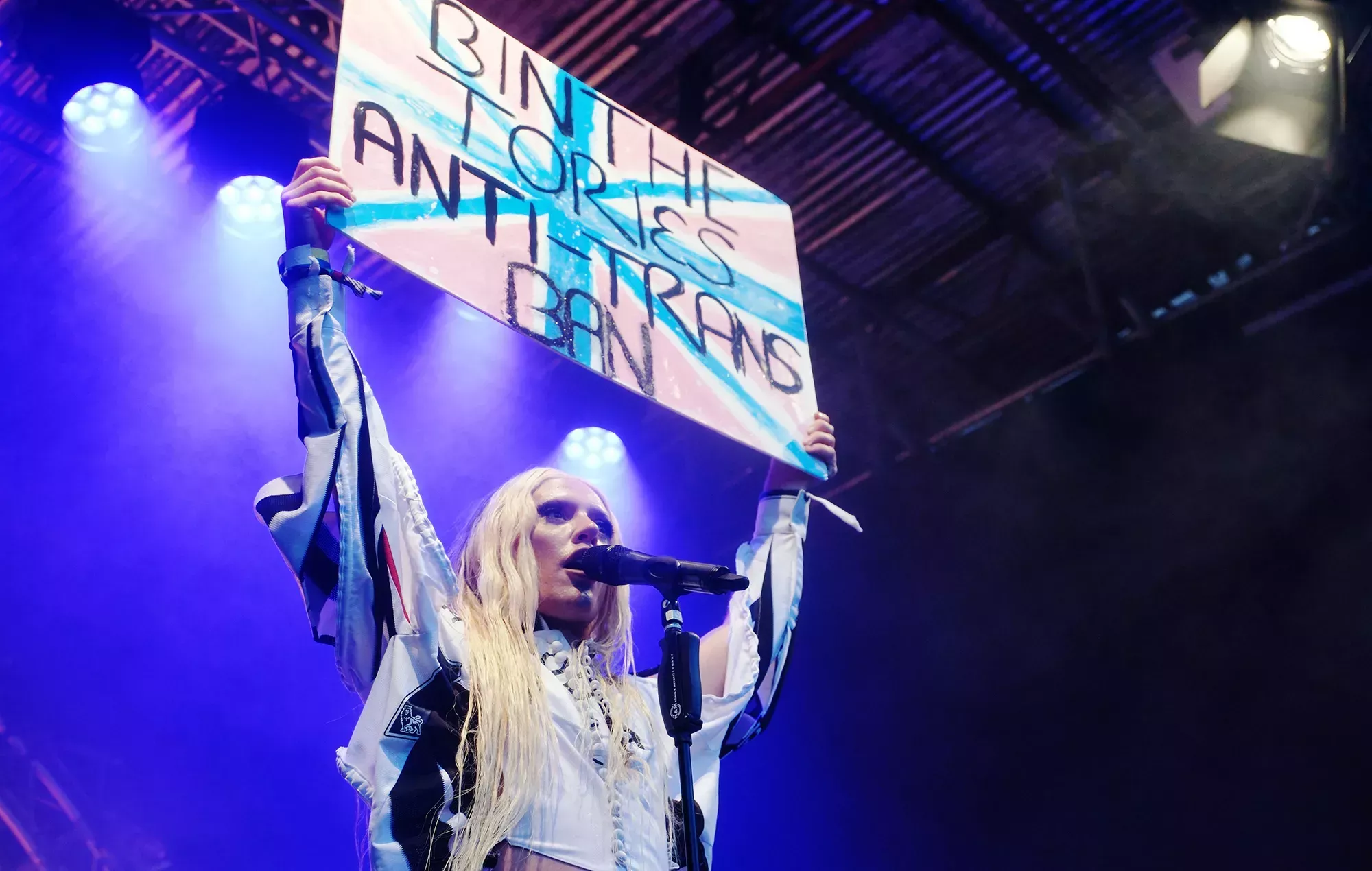 La estrella del pop y ex concursante de RuPaul's Drag Race UK interrumpió su actuación en el escenario de Greenpeace anoche (22 de junio) para sostener una pancarta en la que se leía: "Bin The Tories Anti-Trans Ban". Entre el público también se pudo ver a fans con pancartas similares.