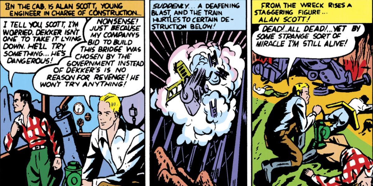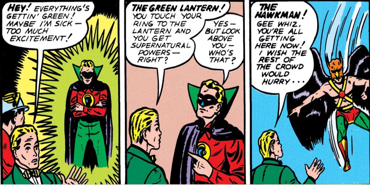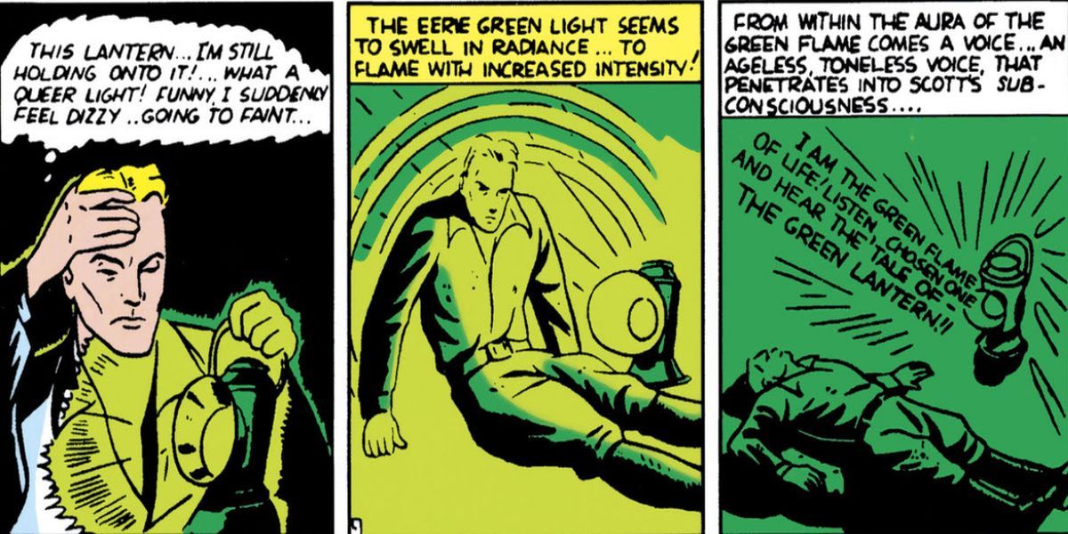 Los orígenes de los superhéroes en la Edad de Oro del cómic no eran tan largos como ahora. No se necesitaban uno o varios números para llegar a la primera aventura de un héroe. Por lo general, sólo se necesitaban unas pocas páginas. Tal es el caso de la transformación de Alan de civil a Linterna Verde.