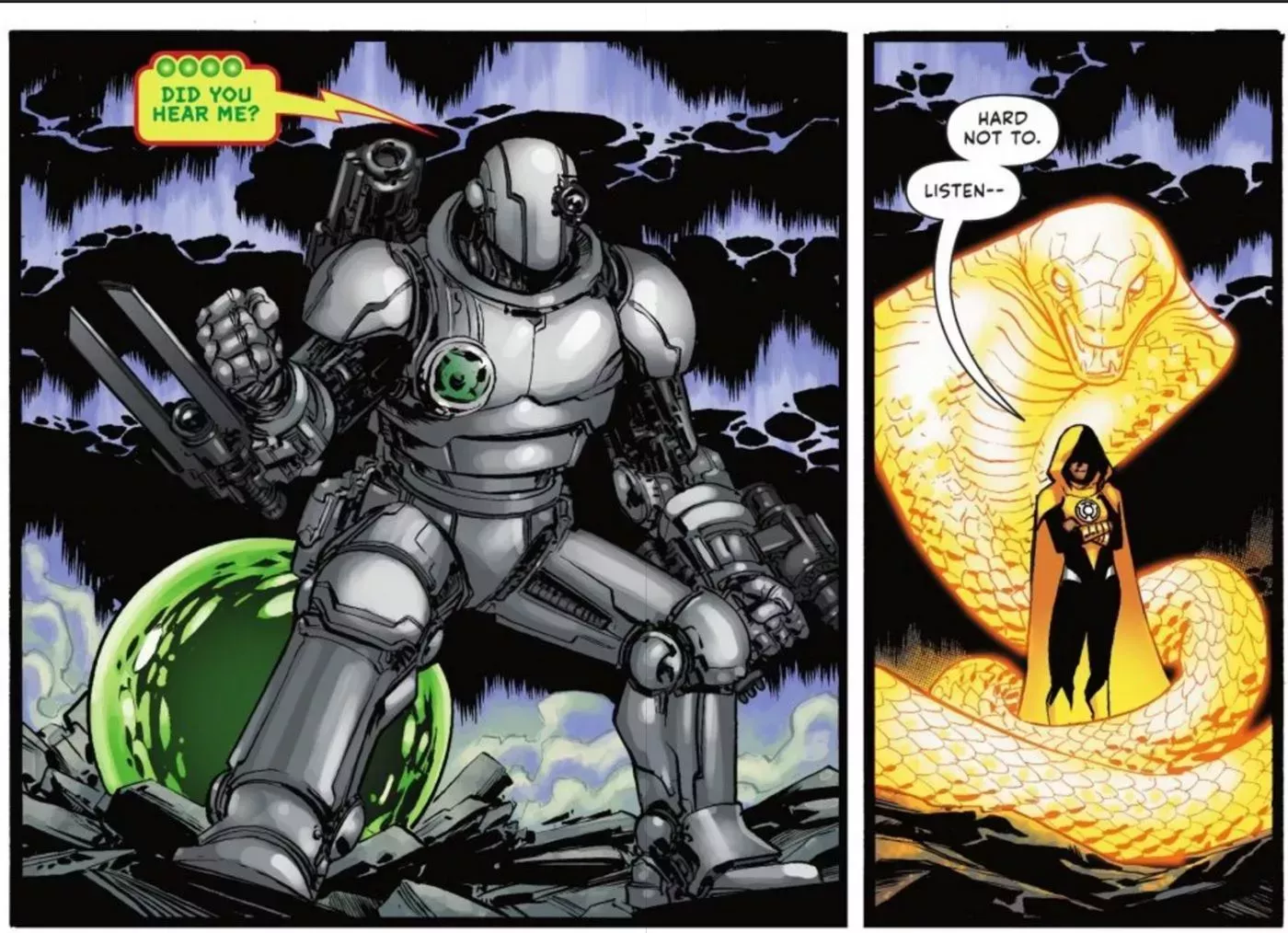 Las naves que defienden el mundo -asà como varios Yellow Lanterns- no consiguen frenarla, y Sinestro observa la batalla con una mirada interesada. Finalmente es un misterioso miembro encapuchado de Sinestro Corp -que posiblemente sea la ex Green Lantern Jessica Cruz- quien la detiene, obligando a la Teen Lantern a enfrentarse a sus propios miedos personales. Al detener la batalla, la figura encapuchada se enfrenta a Simon, que llega al planeta con la autoridad de los Planetas Unidos detrás de él. Aterrizando en el planeta en un orbe verde, Simon sale con su propio traje nuevo de armadura mecánica. En esencia, se trata de una variante propia de Simon de los trajes que llevan Iron Man y War Machine en el Universo Marvel. Incluso tiene un cañón montado en el hombro, similar a la ametralladora Gatling de War Machine.