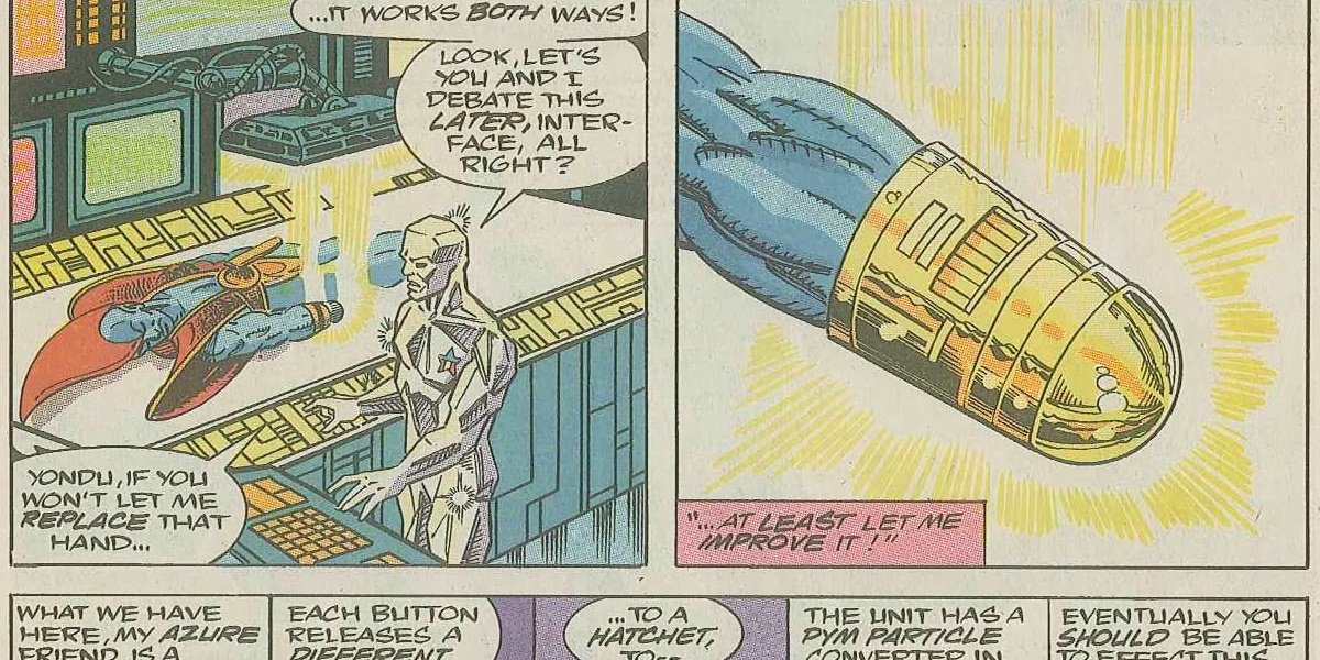 Ahora había una copa de metal que reemplazaba su mano derecha. Con sus armas a un tamaño reducido, Yondu escondía un hacha de guerra, o una lanza de púas, dentro de su taza de metal. Yondu reemplazaría más tarde su copa de metal por un arma biónica, que tenía la forma de su mano original.