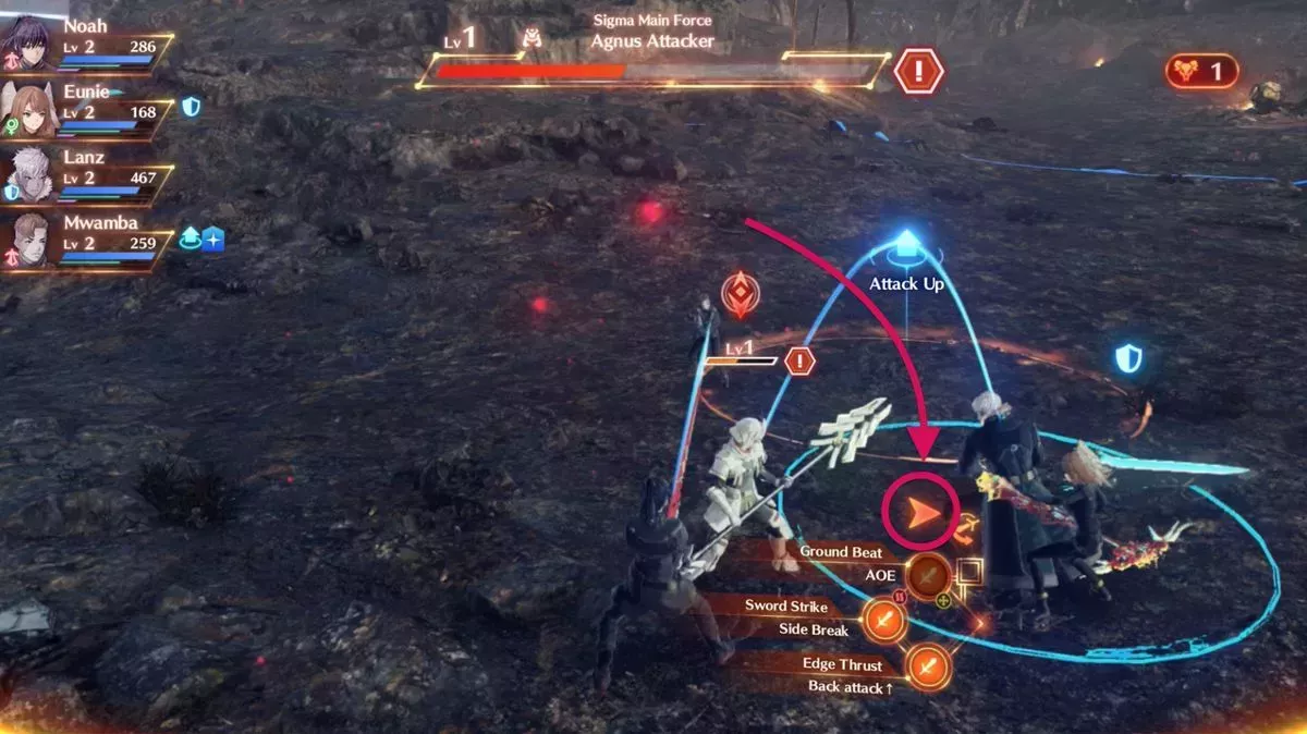 Tácticamente, el aggro determina hacia dónde está mirando el enemigo. Esto es importante porque ciertas artes dependen de tu ubicación en relación con el enemigo al que estás atacando, es decir, de tu posicionamiento. Por ejemplo, el Arte de Empuje del Filo de Noé inflige daño extra cuando se ataca por detrás. Puedes ver tu posición actual en relación al enemigo que estás atacando como una flecha sobre los iconos de las Artes.