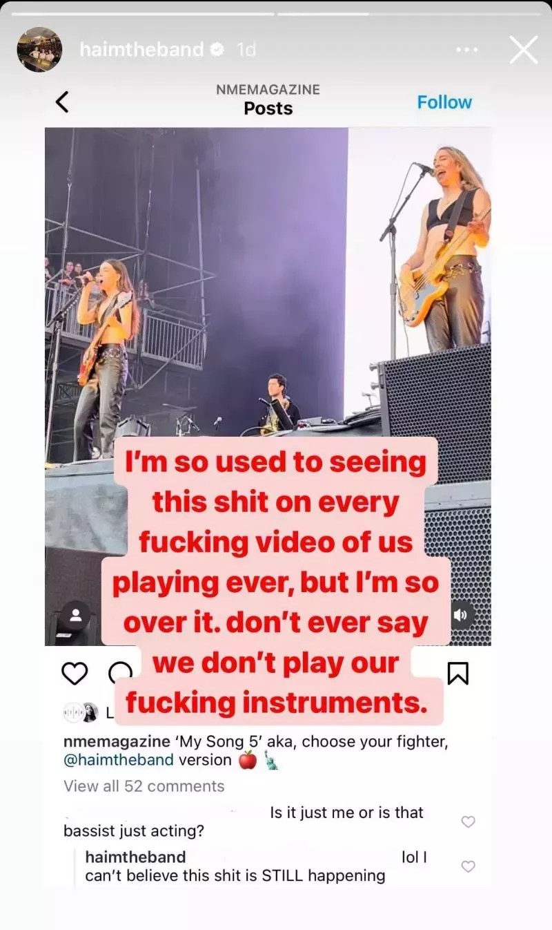 La banda respondió: "Lol, no puedo creer que esta mierda siga pasando". En un post más largo compartido en el Instagram Story de Haim, escribieron: "Estoy tan acostumbrado a ver esta mierda en cada puto vídeo nuestro tocando siempre."
