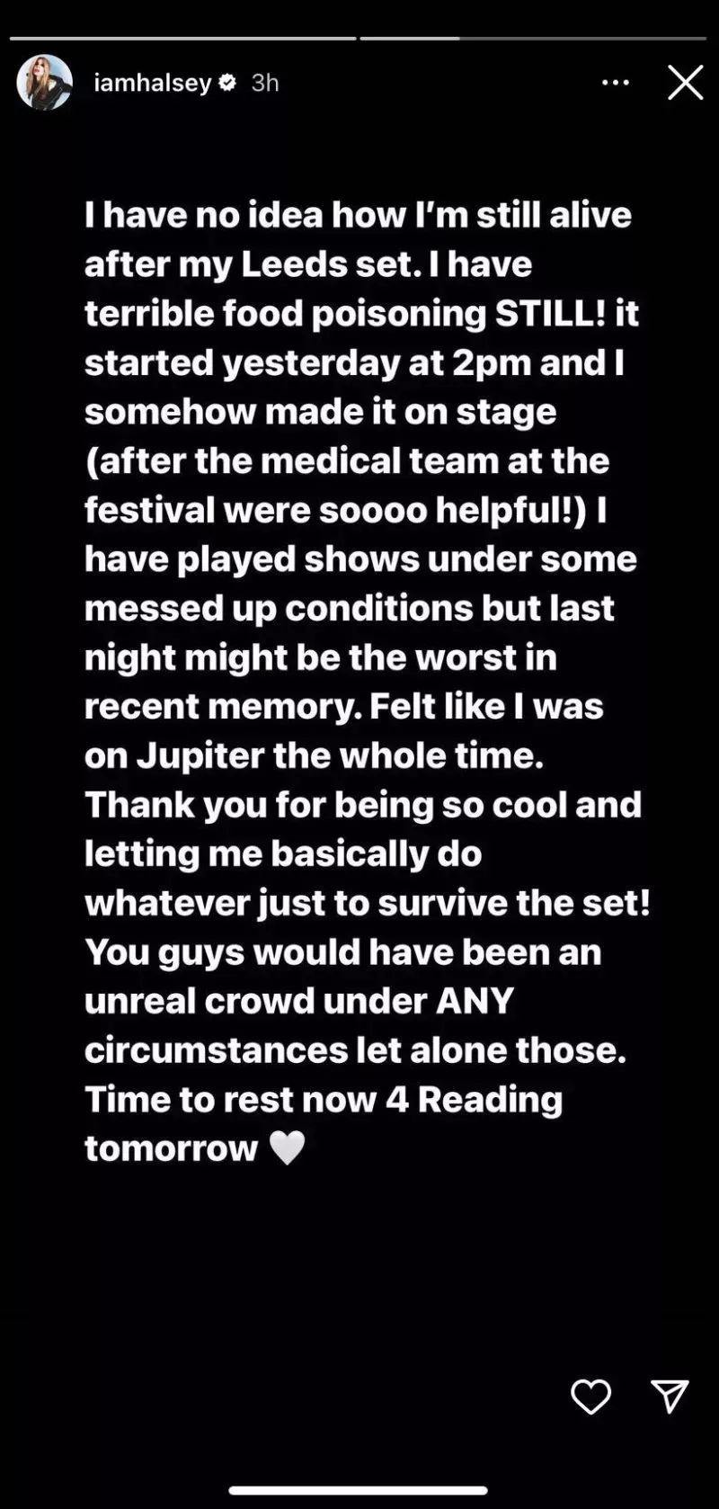 En sus Instagram Stories, Halsey escribió: "No tengo ni idea de cómo sigo viva después de mi set en Leeds. Tengo una terrible intoxicación por comida ¡TODAVÍA! Empezó ayer a las 2 de la tarde y de alguna manera conseguí salir al escenario (¡después de que el equipo médico del festival fuera taaaan servicial!)."