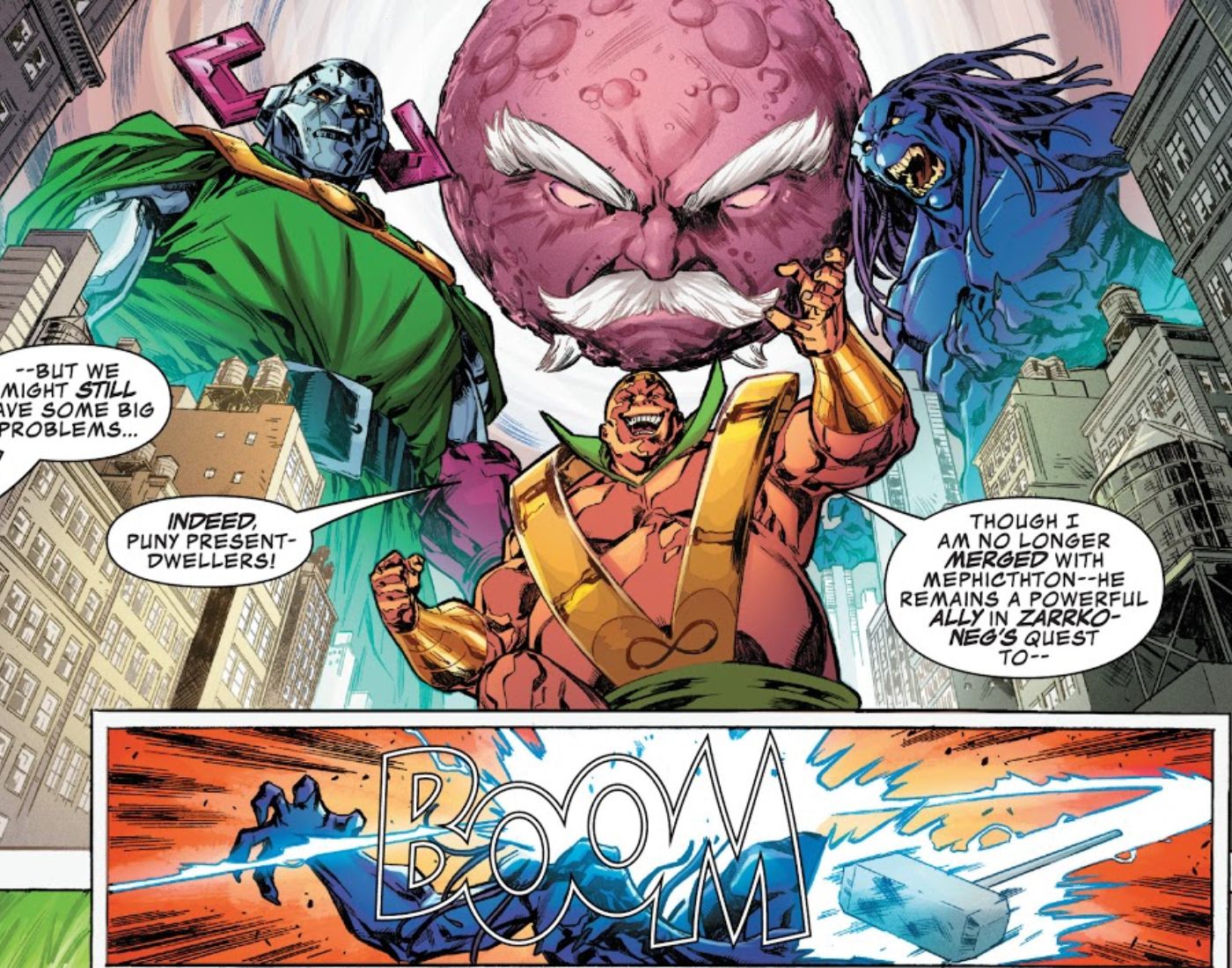 Mephisto, Cthon, Zarrko, Sise-Neg, Doctor Doom, Ego, Galactus y El Extraño también se fusionaron y el resultado fue verdaderamente aterrador. Esta abominación fue derrotada antes de que pudiera liberar todo su poder cuando Hammer Supreme la golpeó con Mjolniron, lo que resultó en suficiente energía para reparar la Gema del Alma dañada. Una vez reparada la poderosa gema, cada personaje fue devuelto a su ser original.