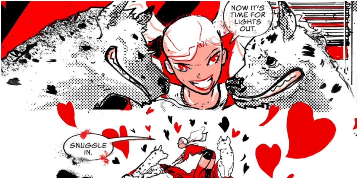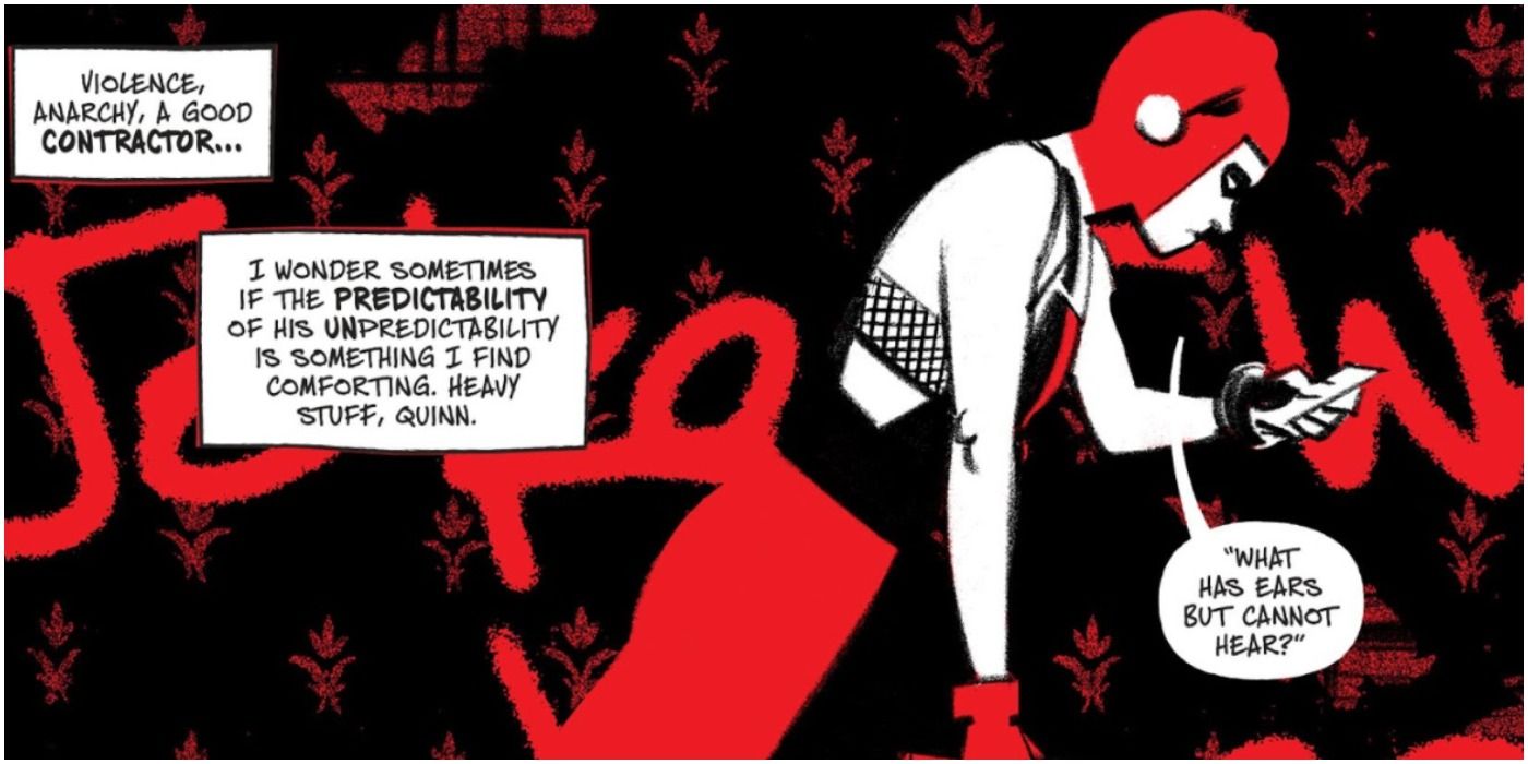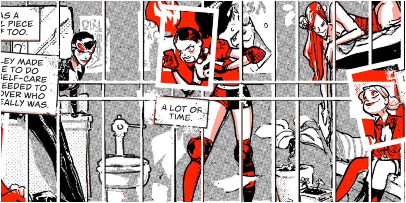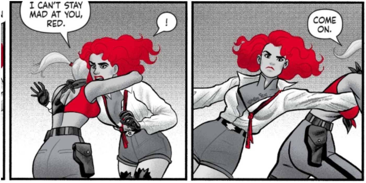 Harley repasa toda su historia, recordando lo estrechamente relacionado con el rojo en su primera noche con el Guasón, su primer asesinato, los crímenes que cometió y las rosas. Cuando Harley se queda sola, reflexiona sobre lo rojo que es el amor, el miedo, la rabia y el color del pelo de Ivy, que finalmente vino a rescatarla. "Rojo" ha sido el apodo de Harley para Ivy durante años, algo que sus médicos claramente no estudiaron.