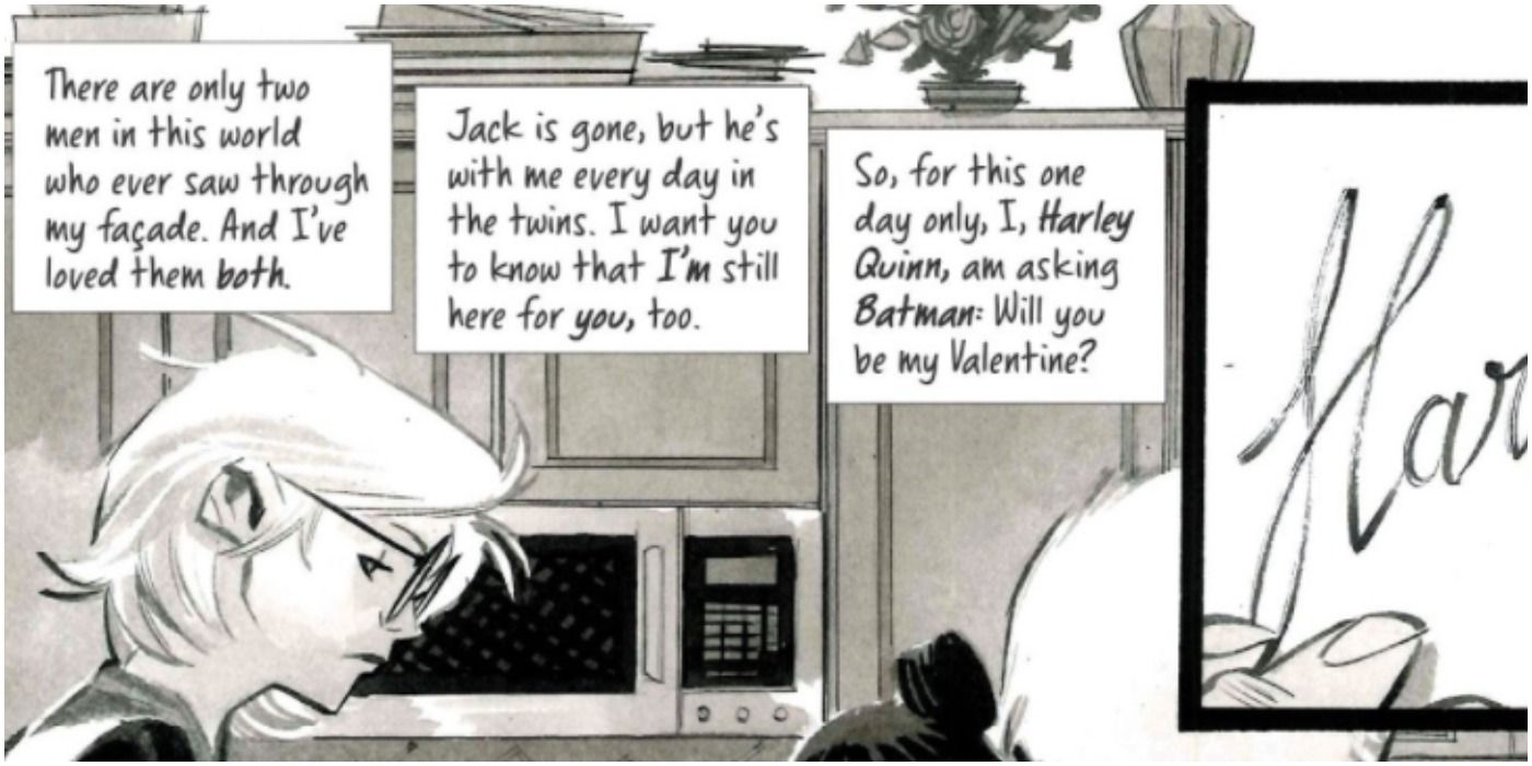 Batman muestra una creciente confianza y afecto por Quinzel a lo largo de estas historias, que ella devuelve. El número seis de Negro + Blanco + Rojo continuó la historia y preparó el escenario para Batman: El Caballero Blanco Presenta - Harley Quinn, que lanzó su primer número el 20 de octubre. Recordando la primera vez que Batman la arrestó, Quinzel escribió sobre lo que la experiencia había significado para ella y le pidió que fuera su valentín.
