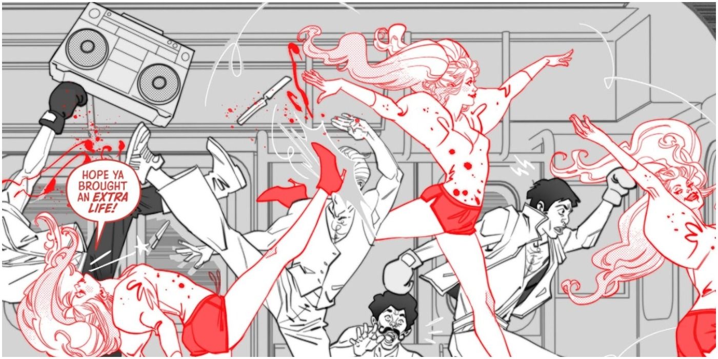 Al encontrarse con grupos como los Boom Boxers, los Manspreaders, los Sourpuss Sluggers, y los Bushwick Bugs, Quinn muestra sus habilidades acrobáticas pateándolos a todos en un panel bellamente dibujado por Marguerite Sauvage (que desafortunadamente no encaja completamente en este sitio; ¡lean el cómic para ver el cuadro completo!)