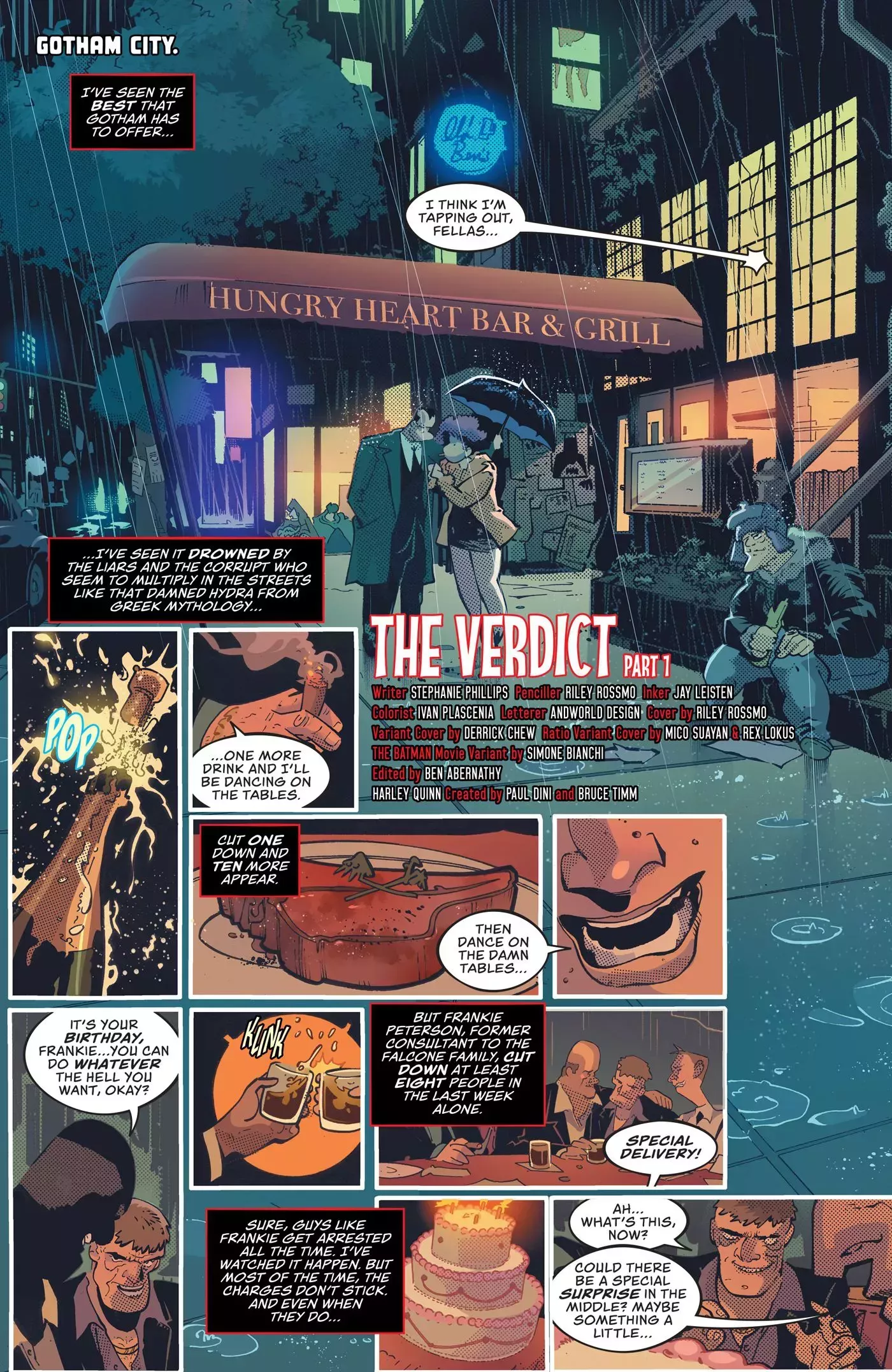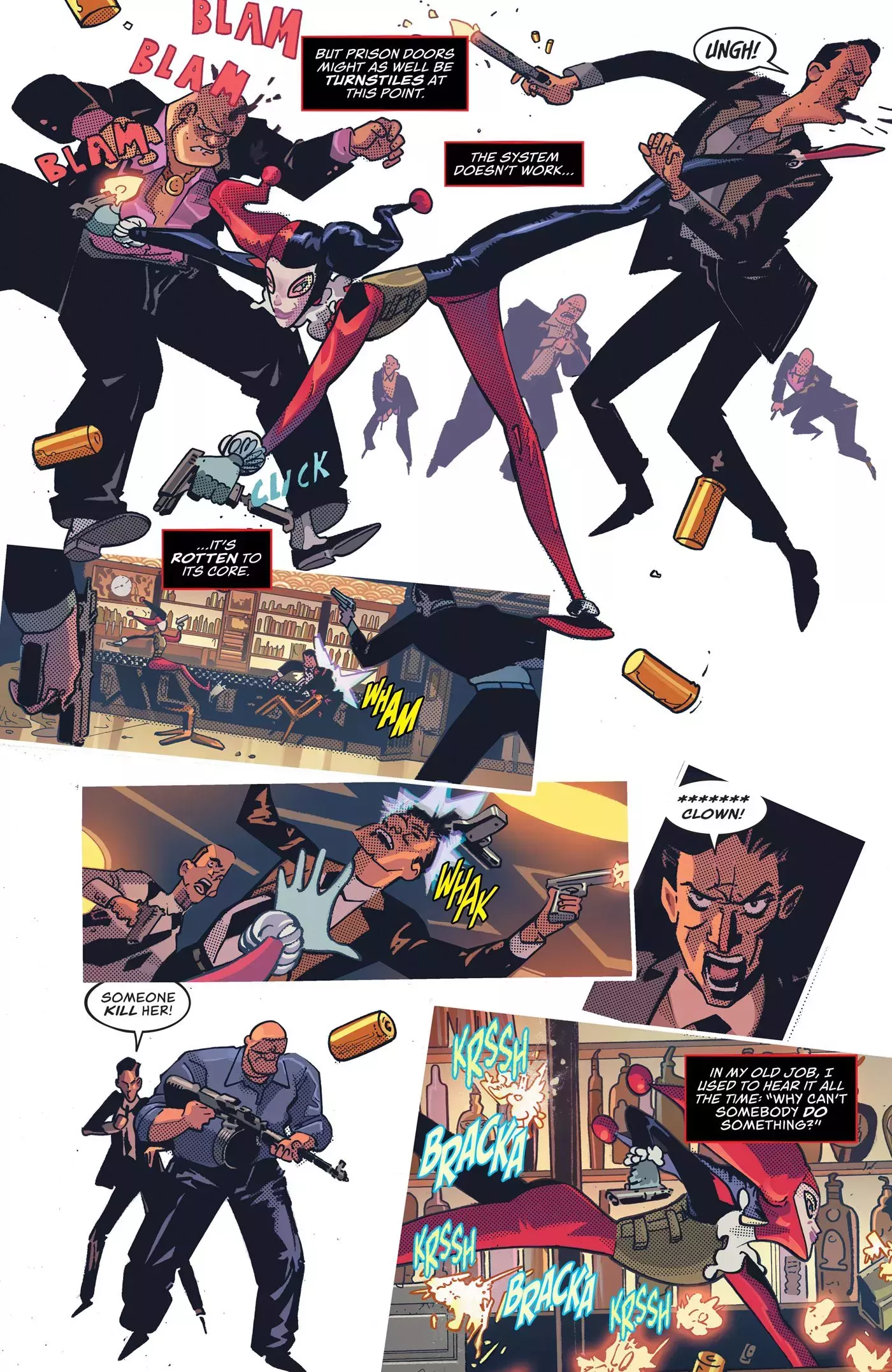 Un adelanto de Harley Quinn #13 de la escritora Stephanie Phillips y el artista Riley Rossmo muestra a alguien que se parece a Harley enfrentándose a criminales con su clásico atuendo de princesa payasa. Su diálogo interior parece algo que el Caballero Oscuro del actor Robert Pattinson anotarÃa mientras escucha "Something in the Way" de Nirvana en The Batman. Sin embargo, dado que esta Harley aparece matando a sus objetivos y usando armas, parece ignorar las reglas de Batman, lo que indica que esta no es Harley en absoluto. Hay más pruebas que sugieren esto a lo largo del avance y la solicitud del número.