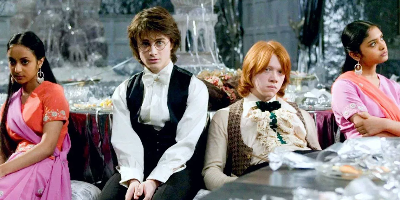Tras ser rechazados por sus primeras opciones, Harry y Ron asisten al baile con los gemelos Patil, a los que ignoran por completo durante todo el evento tras negarse a bailar con ellos. Incluso Hermione, que asiste con Victor Krum, termina la noche peleando con Ron y dejando atrás a su pareja.