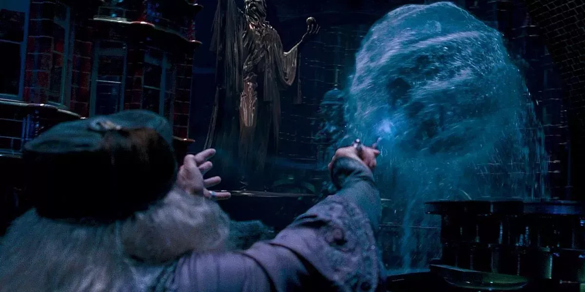 Al final de su batalla, Dumbledore lanza un hechizo sin nombre que esculpe el agua de la Fuente de los Hermanos Mágicos alrededor del Señor Oscuro en un "capullo de cristal fundido". Esto obliga a Voldemort a poseer a Harry en lugar de enfrentarse directamente a Dumbledore.