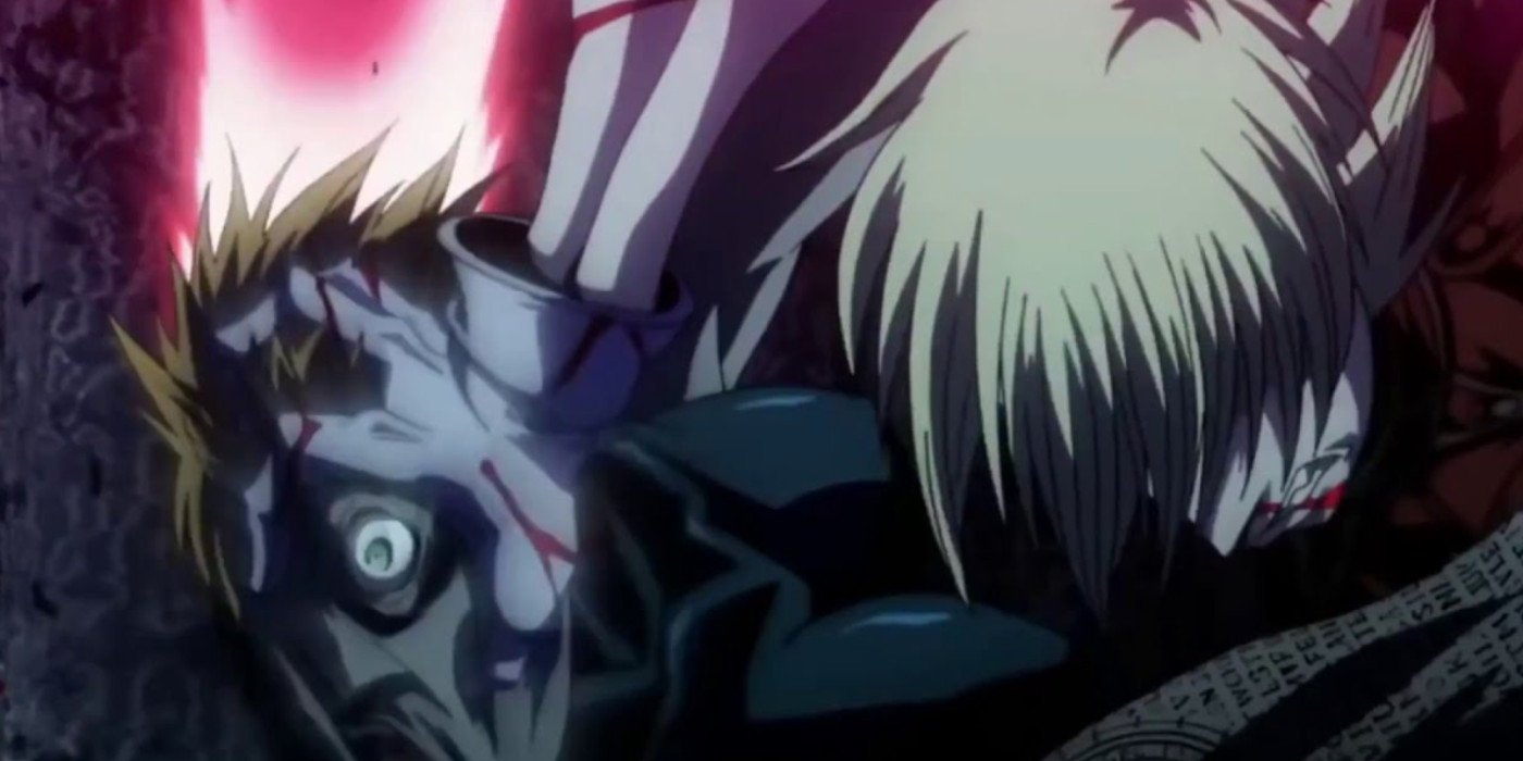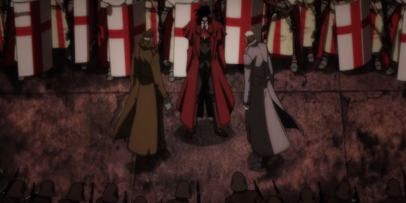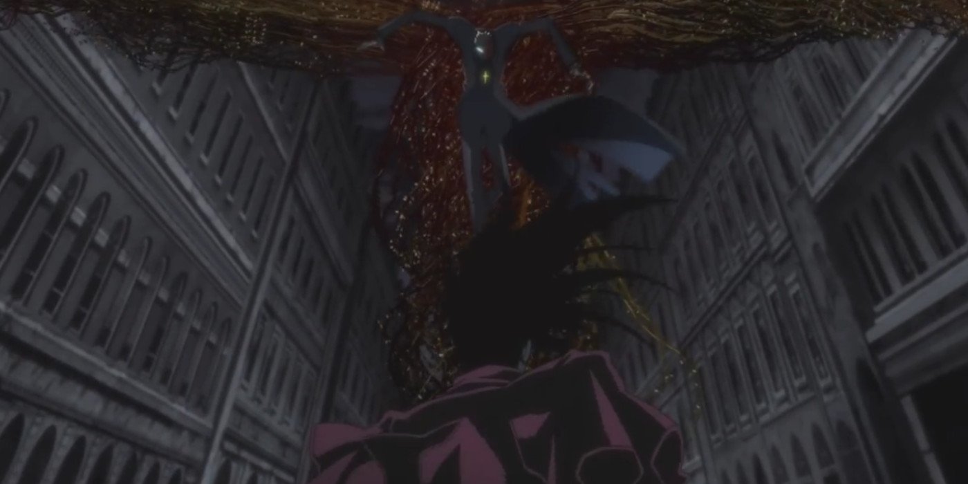 Al principio de la serie, Alucard depende principalmente de sus armas. ¿Por qué no debería? El par de pistolas que blande son casi de la longitud de sus antebrazos, lo que no es poca cosa dada la estética de diseño del personaje de Kouta Hirano. Así que cuando el cuartel general de Hellsing sufre un allanamiento de morada por parte de las fuerzas de los vampíricos hermanos Valentín, el rey de No-Life está encantado con el potencial de un compañero de paso nocturno que podría estar a su nivel. Alucard está a la altura del desafío al descartar las armas de su marca registrada... y su forma corpórea.