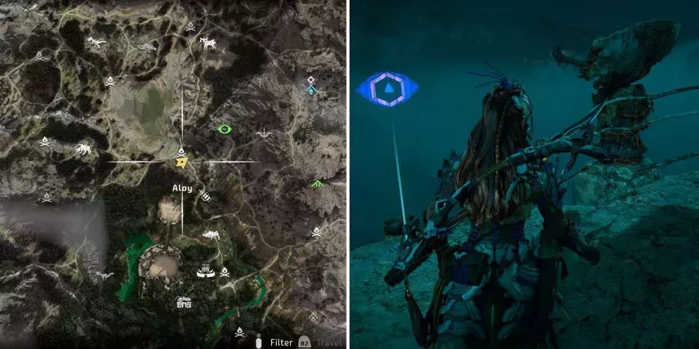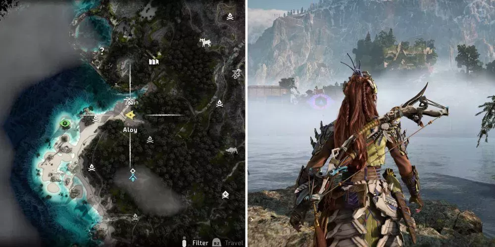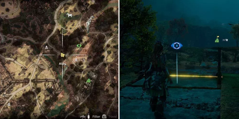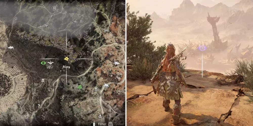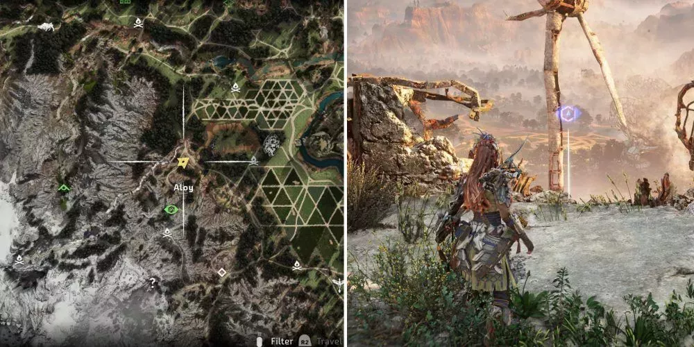 Al escanear la torre de Daunt Vista Point, Aloy recibirá una imagen que deberá alinear con su ubicación actual. Para The Daunt Vista Point, Aloy no tendrá que ir muy lejos. A poca distancia al noreste, habrá un puente roto. Párate en el borde de este puente para alinear la imagen en el Foco de Aloy para revelar. En las imágenes del mapa a lo largo de esta lista, Aloy estará de pie donde se encuentra la Torre de Vista Point y el marcador de ojo verde es donde Aloy tendrá que pararse para alinear la foto de Vista Point.