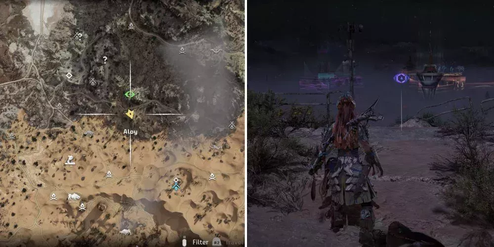 La ubicación de The Stillsands Vista Point será justo al norte de The Stillsands Vista Point Tower. Una vez que Aloy llegue a la ubicación apropiada, alinea la imagen de The Stillsands Vista Point con The Stillsands Vista Point Tower para revelar lo que formalmente era Las Vegas.