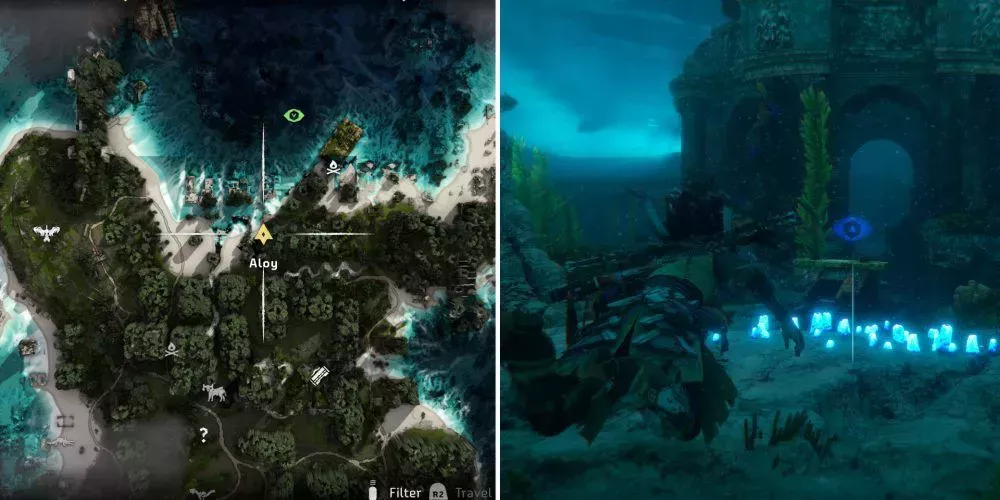 Aloy tendrá que nadar primero hacia el norte, donde encontrará el edificio representado en la imagen del Punto de Vista de Shrouded Heights. Para encontrar el lugar donde tiene que pararse (o flotar), Aloy tendrá que nadar hacia las luces azules de un edificio en ruinas. Aquà también habrá un punto de impulso para nadar. Aquà es donde Aloy necesita estar para alinear la imagen del Punto de Vista de Shrouded Heights.