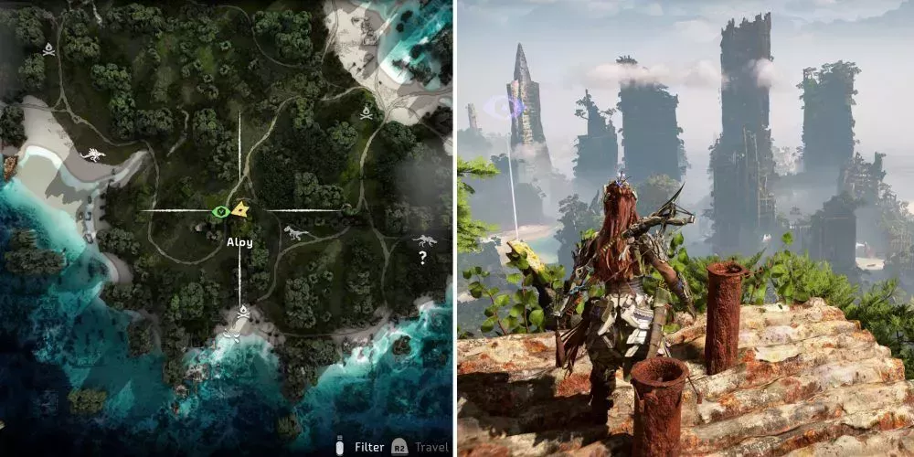 Esta isla tendrá numerosos árboles de diferentes tamaños encima de una formación rocosa. En el lado de la formación rocosa, habrá un punto de agarre. Aloy tendrá que alinear la imagen del Punto de Vista de la Costa Larga hacia el edificio en ruinas, que descubrirá que es el edificio de Faro Automated Solutions.