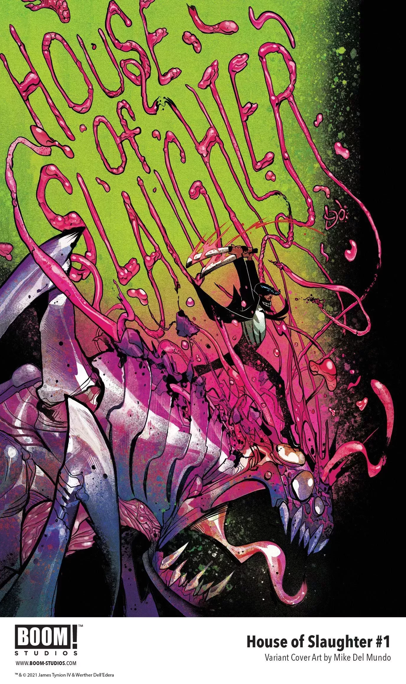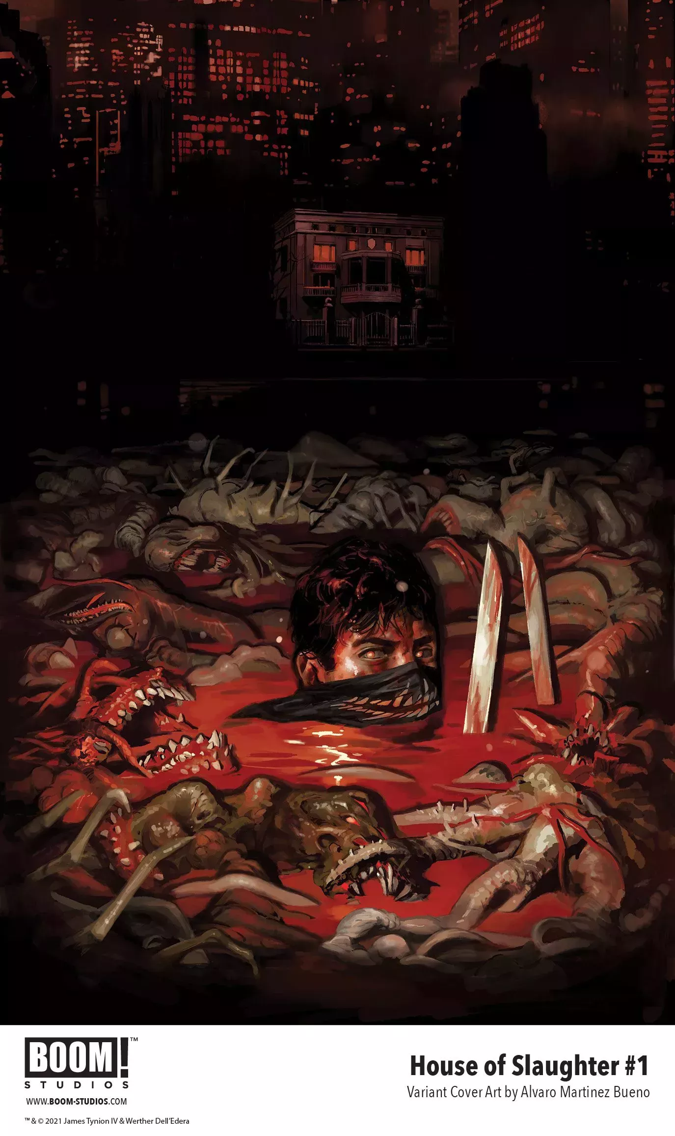 House of Slaughter nº 1 cuenta con portada principal de los artistas de la serie Dell'Edera y Shehan, así como con portadas variantes de Álvaro Martínez Bueno(The Nice House on the Lake), Jenny Frison(Wonder Woman), Mike Del Mundo(X-Men, Thor) y Gabriele Dell'Otto(Detective Comics). La serie sale a la venta en octubre a través de BOOM! Studios.