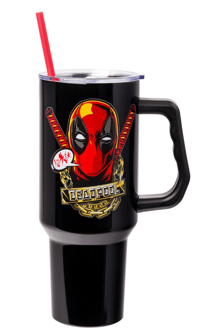 Si tú o tu pareja son grandes fanáticos de Deadpool, ¡entonces esta taza de acero inoxidable de 40oz es perfecta para ustedes! Los compradores de Amazon han calificado este producto con 4.7 de 5 estrellas. La taza viene con un mango y un deslizador seguro para mantener la pajita roja en su lugar.