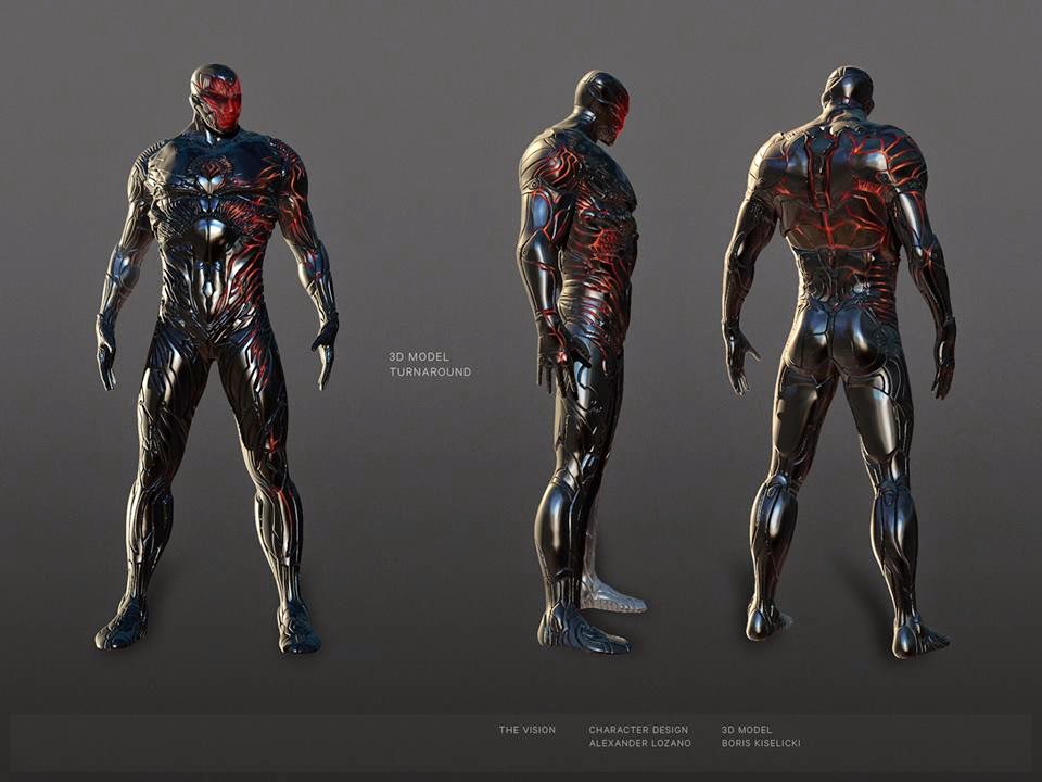 Aunque distan de estar confirmadas, estas imágenes del diseño de La Visión en 'Los Vengadores 2' encajan bastante con las primeras filtraciones que apuntaban a que el sintezoide sería una armadura de Iron Man “humanizada”, con consciencia propia, tecnología de nanobots y capa desplegable.