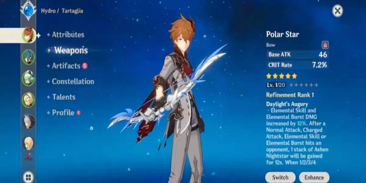 La cantidad de Estrella Nocturna de Ceniza recogida, que es un máximo de cuatro, coincide con lo mucho que se potenciará el ataque del personaje. Estrella Polar es ideal para muchos personajes, pero algunos que se beneficiarían mucho de ella son Ganyu, Childe, Fischl y Venti.