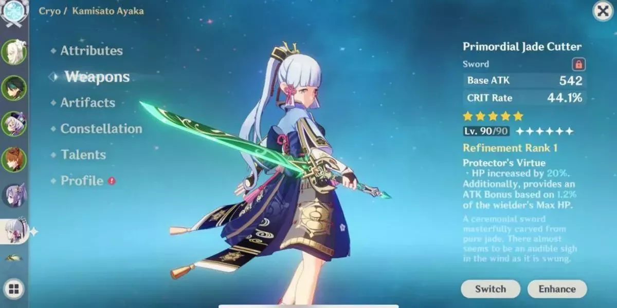 El Cortador de Jade Primordial es una espada de cinco estrellas que se celebra como una de las mejores espadas del juego. La espada tuvo recientemente su reedición durante el estandarte de Kokomi. Su subestado es un aumento de la tasa de hematocrito. La habilidad de esta arma es que aumenta los HP del personaje y luego proporciona una bonificación de ataque basada en los HP máximos que tiene el personaje.
