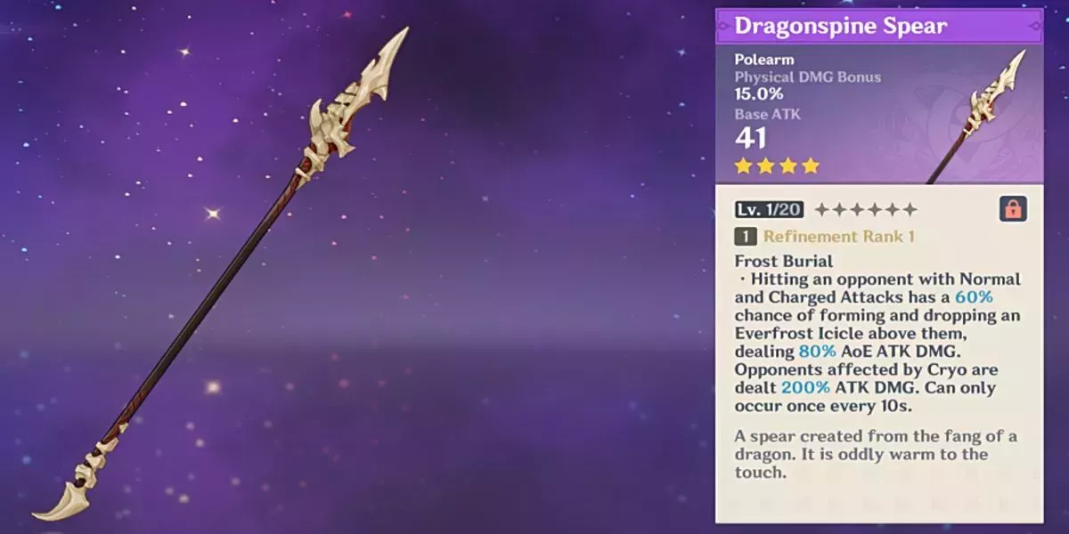 La lanza de Dragonspine es un arma de asta de cuatro estrellas que se puede obtener al completar la misión Colmillos Suprimidos en Dragonspine. Los jugadores tendrán que encontrar los materiales para fabricar la lanza y luego fabricarla. El subestado del arma de asta es una bonificación de daño físico aumentada. Cuando los personajes realicen un ataque normal o cargado con esta arma, habrá una posibilidad de que un carámbano de Everfrost dañe a los oponentes.