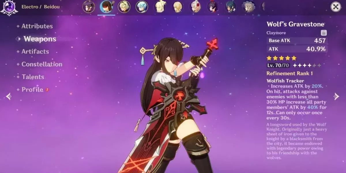 La Lápida del lobo es ideal para cualquier usuario de claymore del juego, pero los personajes a los que mejor se adapta son Diluc, Beidou y Razor.