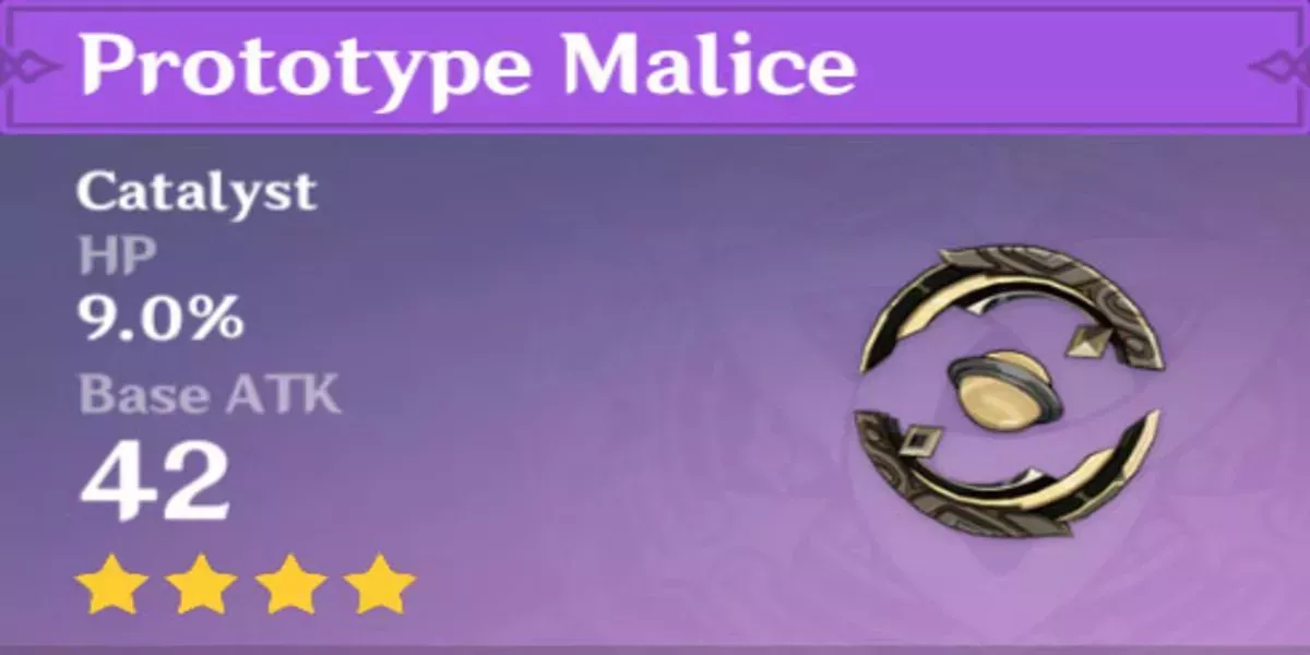 El Prototipo Malicia, o Prototipo Ámbar, es un catalizador de cuatro estrellas. Su subestado es un aumento de HP. Los jugadores pueden forjar esta arma en cualquier herrero disponible con un tocho de catalizador de Northlander, trozos de cristal y trozos de hierro blanco. Cuando los personajes están equipados con este catalizador, su ráfaga elemental restaurará la energía, y los miembros del grupo tendrán una pequeña cantidad de HP restaurada durante su duración.