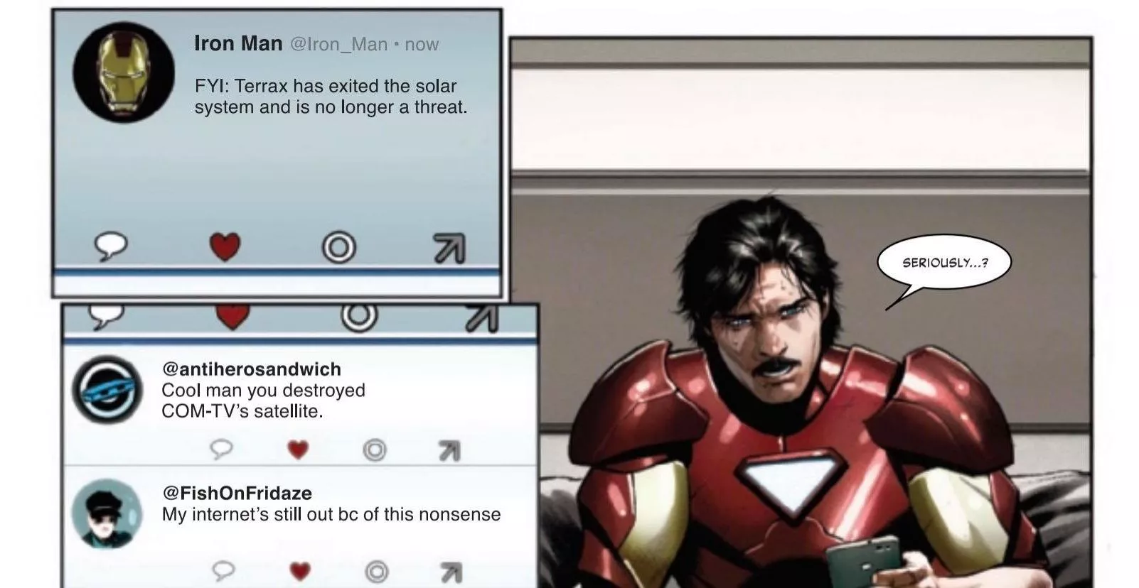 Sin embargo, con cada uno de sus tweets, Tony se enfrenta a las realidades de los medios sociales, que es un paisaje lleno de trolls y de enemigos. Cuando informa a sus seguidores que Terrax ha sido derrotado, la mayoría responde con quejas sobre la destrucción del satélite, y cómo les ha cortado temporalmente el acceso al cable o a Internet. Del mismo modo, su cita es despedida, mientras que la actualización de su partido provoca que sus seguidores se quejen de su riqueza.