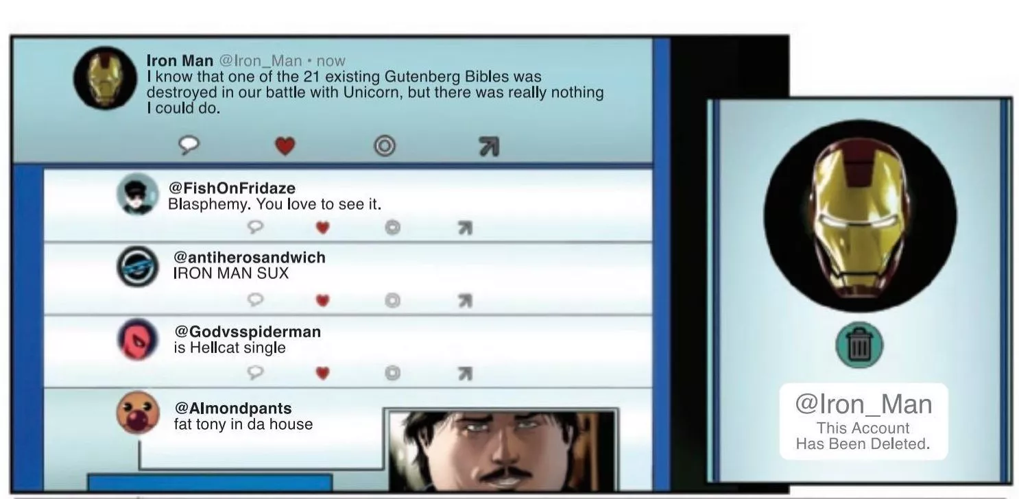 A lo largo de la mayor parte de Iron Man # 1, se hace evidente que Tony se está alejando del mundo. Después de todo lo que ha pasado recientemente en Empyre y Iron Man 2020, trata de compensar todo comenzando de nuevo, pero su soledad es palpable. El odio online de los trolls vocales de Twitter no ayuda a las cosas, sólo aumentan su sensación de estar solo. Después del último tweet del número, Tony hace lo más inteligente y simplemente borra su cuenta.