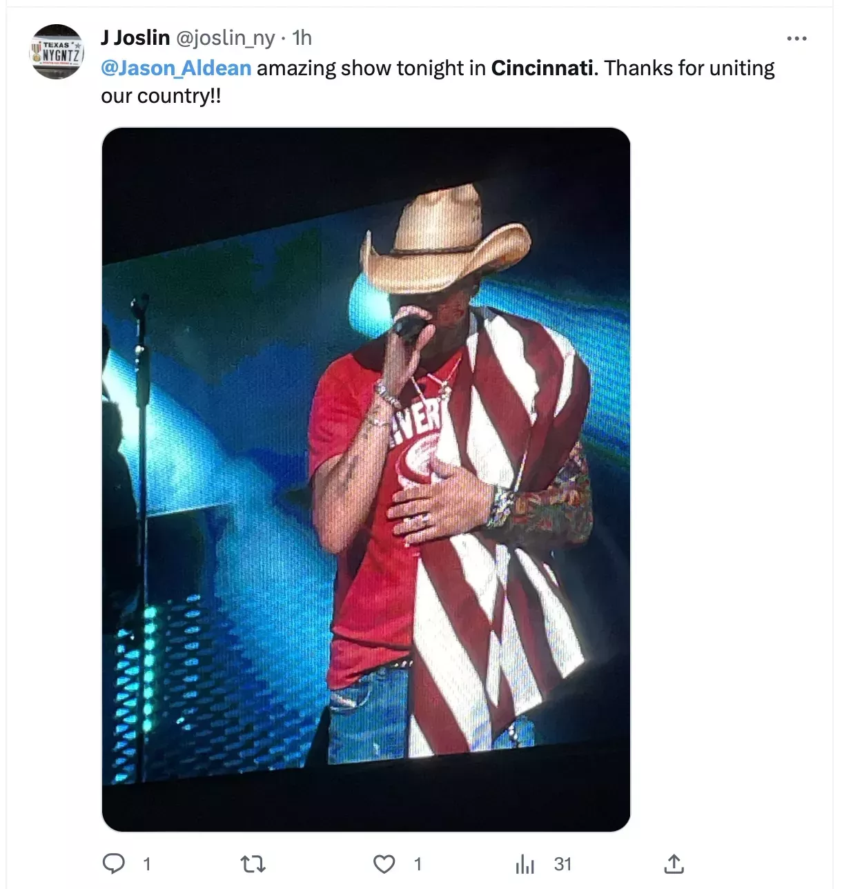 "Ha sido una semana larga. He visto un montón de cosas sugiriendo que soy esto, sugiriendo que soy aquello", dijo Aldean, mientras el público del Riverbend Music Center abucheaba la oposición a la que se ha enfrentado. "Creo que todo el mundo tiene derecho a opinar. Puedes pensar algo todo lo que quieras, eso no significa que sea verdad. Lo que soy es un estadounidense orgulloso... Amo a nuestro país. Quiero que vuelva a ser lo que era antes de que nos pasara toda esta mierda. Amo a mi país. Amo a mi familia. Y haré lo que sea para protegerlo", declaró, mientras la multitud empezaba a corear "¡USA! USA!"