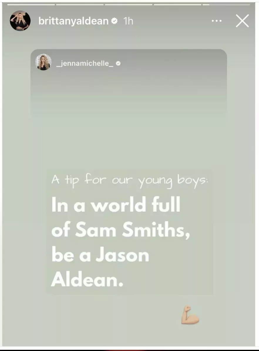 "Try That in a Small Town" no hace ninguna referencia a cuestiones trans o LGBTQ+, ni a las vacunas o el enmascaramiento, por nombrar algunos de los temas que el cantante y su esposa han abordado polémicamente en los últimos dos años. Sin embargo, la esposa del cantante, Brittany Aldean, que se hizo muy conocida el año pasado por enemistarse con la comunidad trans, tomó su Instagram Story en medio de la tormenta para compartir un mensaje que algunos tomaron como teñido de homofobia: "Un consejo para nuestros chicos jóvenes: En un mundo lleno de Sam Smiths, sé un Jason Aldean".