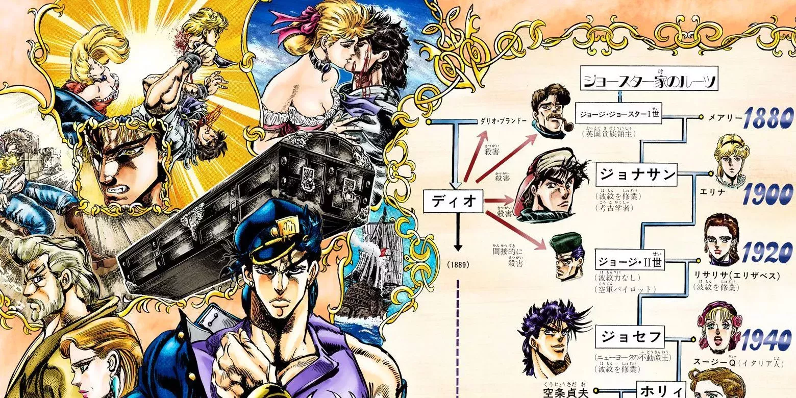 Una de las razones por las que JoJo's Bizarre Adventure es un enfoque único de la narrativa shonen es que cuenta una larga narrativa generacional que abarca varias décadas y cubre varios descendientes de la familia Joestar, en lugar de un solo protagonista. Muchas de las ramas dispares del árbol genealógico de los Joestar se rellenan, pero el manga de Stardust Crusaders presenta explícitamente el linaje completo de los Joestar, incluido el padre de Jotaro Kujo. Sadao Kujo, el padre de Jotaro, era un famoso músico de jazz que está de gira durante los acontecimientos de Stardust Crusaders .