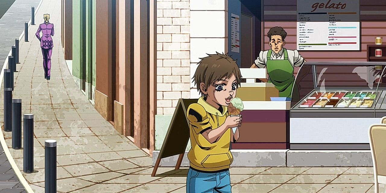 En el primer episodio, Giorno compra a un niño un helado con el dinero que robó a dos turistas. El equipo del anime decidió añadir esta escena para hacer de Giorno un personaje más compasivo, teniendo en cuenta que acaba de robar dinero a la gente. Aunque esta escena no existe en el manga, es una buena muestra de los matices del personaje de Giorno. A lo largo de la quinta parte, oscila entre la crueldad de Dio y la compasión de Jonathan. Establecer esta dualidad en los primeros 10 minutos del primer episodio es una genialidad.