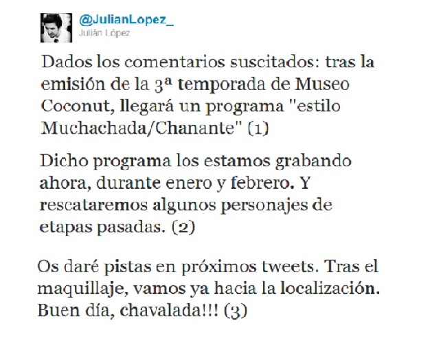 Ha sido Julián López en su Twitter el que ha confirmado que están rodando nuevos capítulos de 'Museo Coconut' y que después comenzarán a rodar en formato Chanante recuperando nuevos personajes. Suponemos que seguirán emitiendo en Neox. Nos congratulamos enormemente.