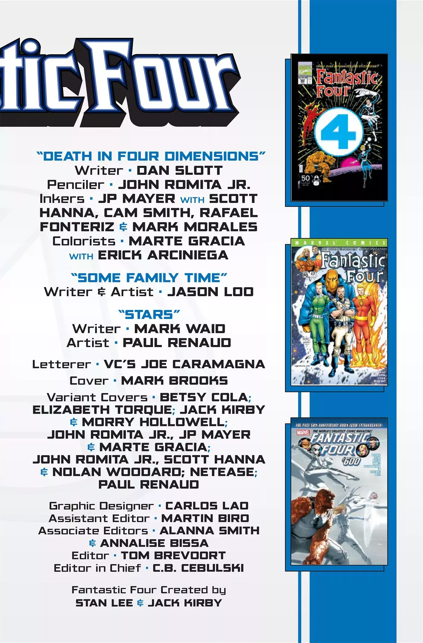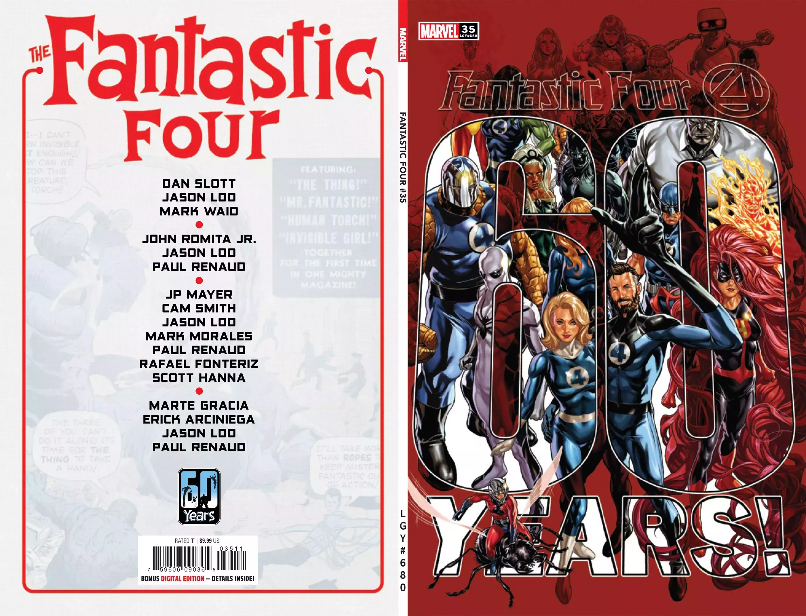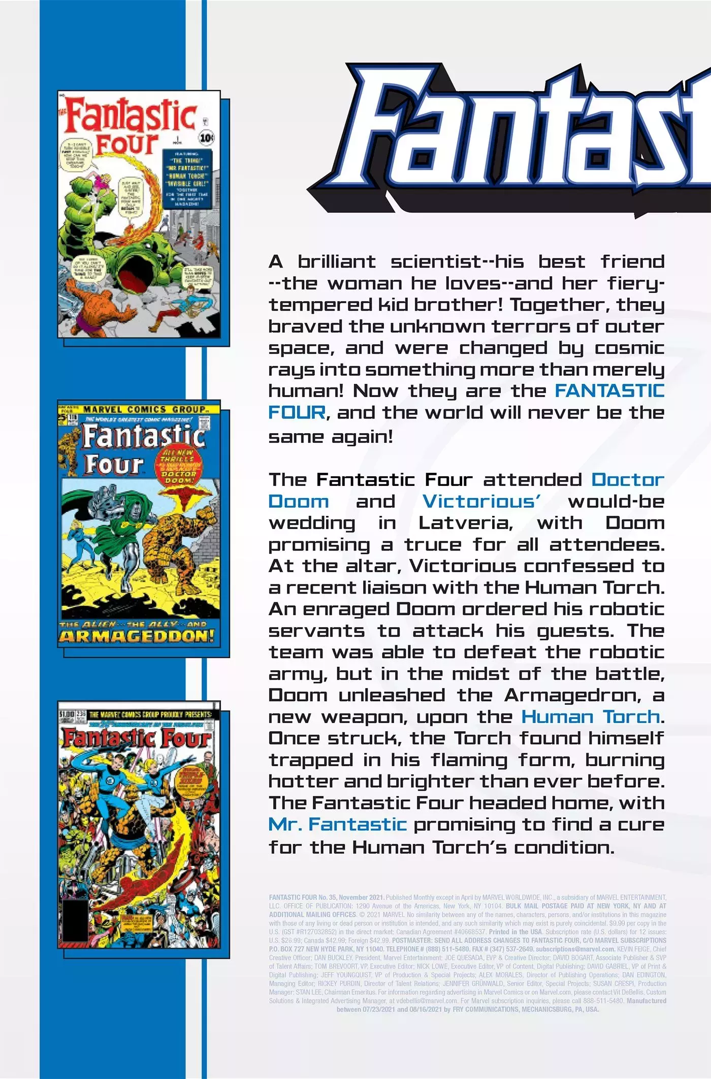 Fantastic Four #35 tendrá historias escritas por Dan Slott, Mark Waid y Jason Loo, con arte interior de John Romita Jr, Paul Renaud y Loo. Otros colaboradores del libro y sus portadas variantes son Cam Smith, Mark Morales, Rafael Fonteriz, Scott Hanna, J. P. Mayer, Erick Arciniega, Marte Gracia, Joe Caramagna, Carlos Lao, Mark Brooks y otros, con una variante especial a escala 1:100 con ilustraciones de Jack Kirby. El número sale a la venta en Marvel Comics el 15 de septiembre de 2021.