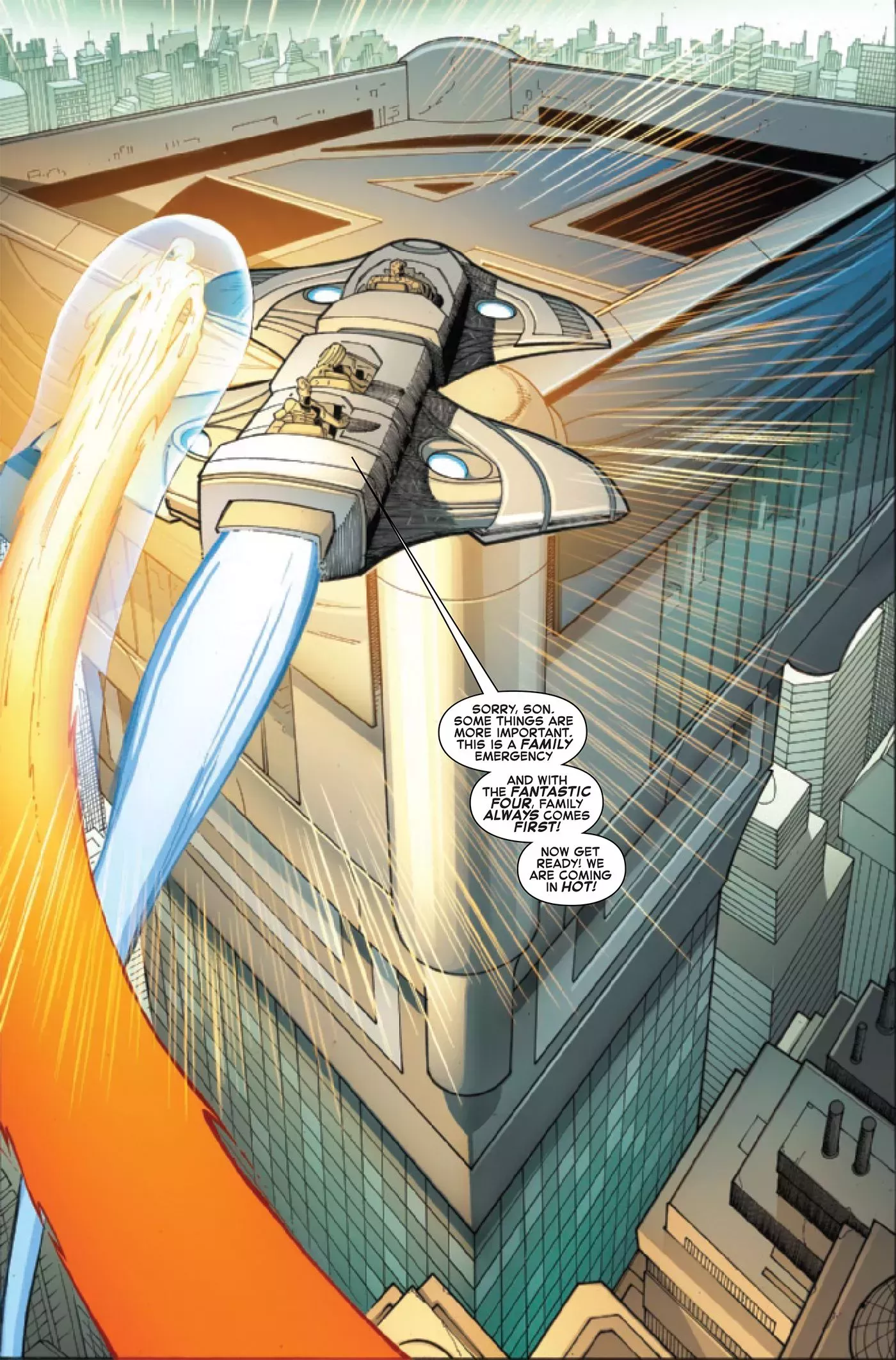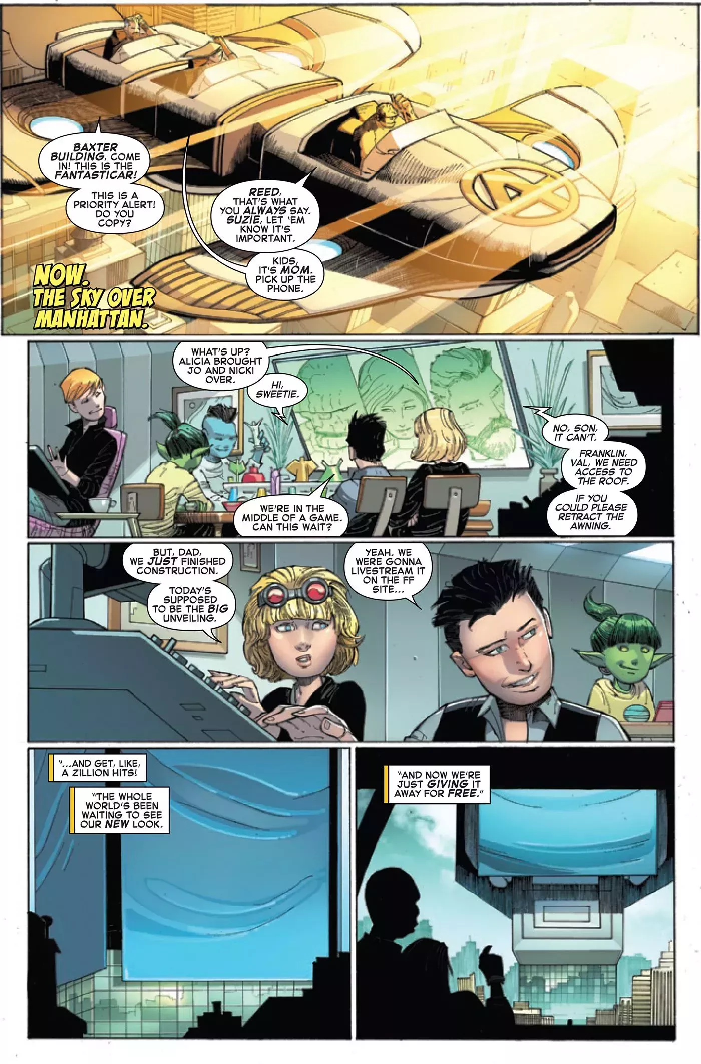 El avance se abre con la llegada de los Cuatro Fantásticos de vuelta al Edificio Baxter. En el último arco, Johnny Storm fue castigado por el Doctor Doom por tener relaciones íntimas con la futura novia del gobernante, Victorious, utilizando un dispositivo llamado "Armagedron" para encerrar a la Antorcha Humana en su estado de fuego para siempre. En dos páginas del avance se ve cómo el equipo vuelve a casa para solucionar el problema y encontrar una cura, que también se explorará en el siguiente número.
