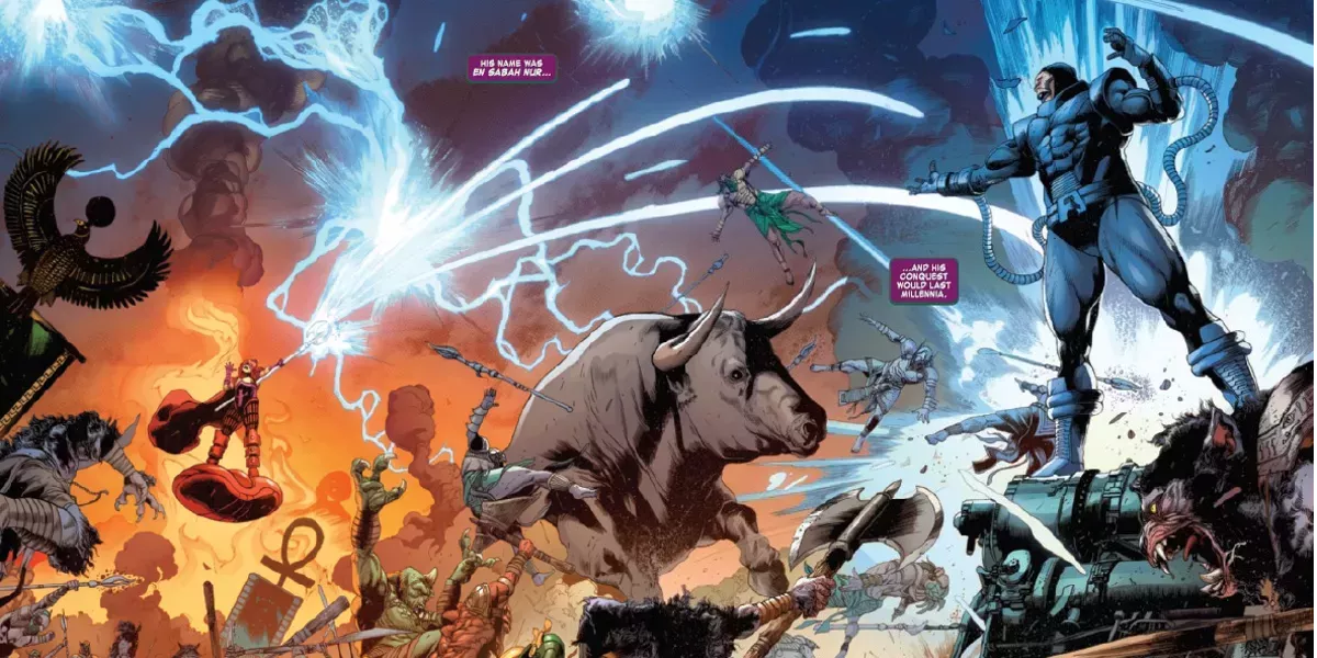 A pesar del giro bastante heroico que ha tomado recientemente en el presente, este Apocalipsis aún no se ha reformado. De hecho, fue el enorme poder del mutante y su voluntad de utilizarlo lo que atrajo inicialmente a Rama-Tut a Egipto con la esperanza de encontrar al poderoso ser y convertirlo en heredero. En cambio, el viajero del tiempo se encontró con una violenta resistencia, y cuando Rama-Tut fue finalmente depuesto por los Cuatro Fantásticos, fue Apocalipsis quien se adelantó para reclamar su trono. Por lo que parece, esta es exactamente la misma situación en la que ha caído el joven Nathaniel Richards, y es exactamente lo que necesita para devolver el golpe a otra versión retorcida de sí mismo.