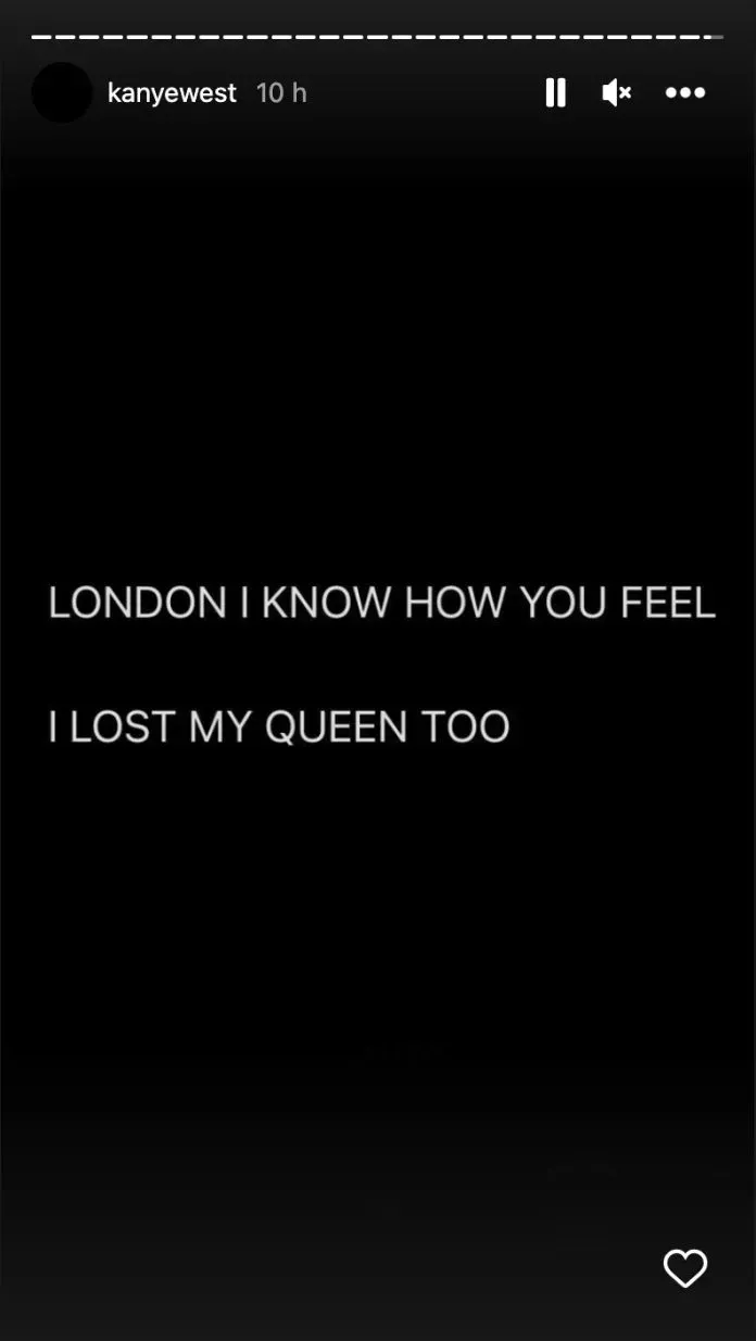 En un nuevo post en Instagram, Kanye comparó su dolor con el de quienes lloran la muerte de la Reina, escribiendo: "Londres sé cómo te sientes. Yo también perdí a mi Reina".