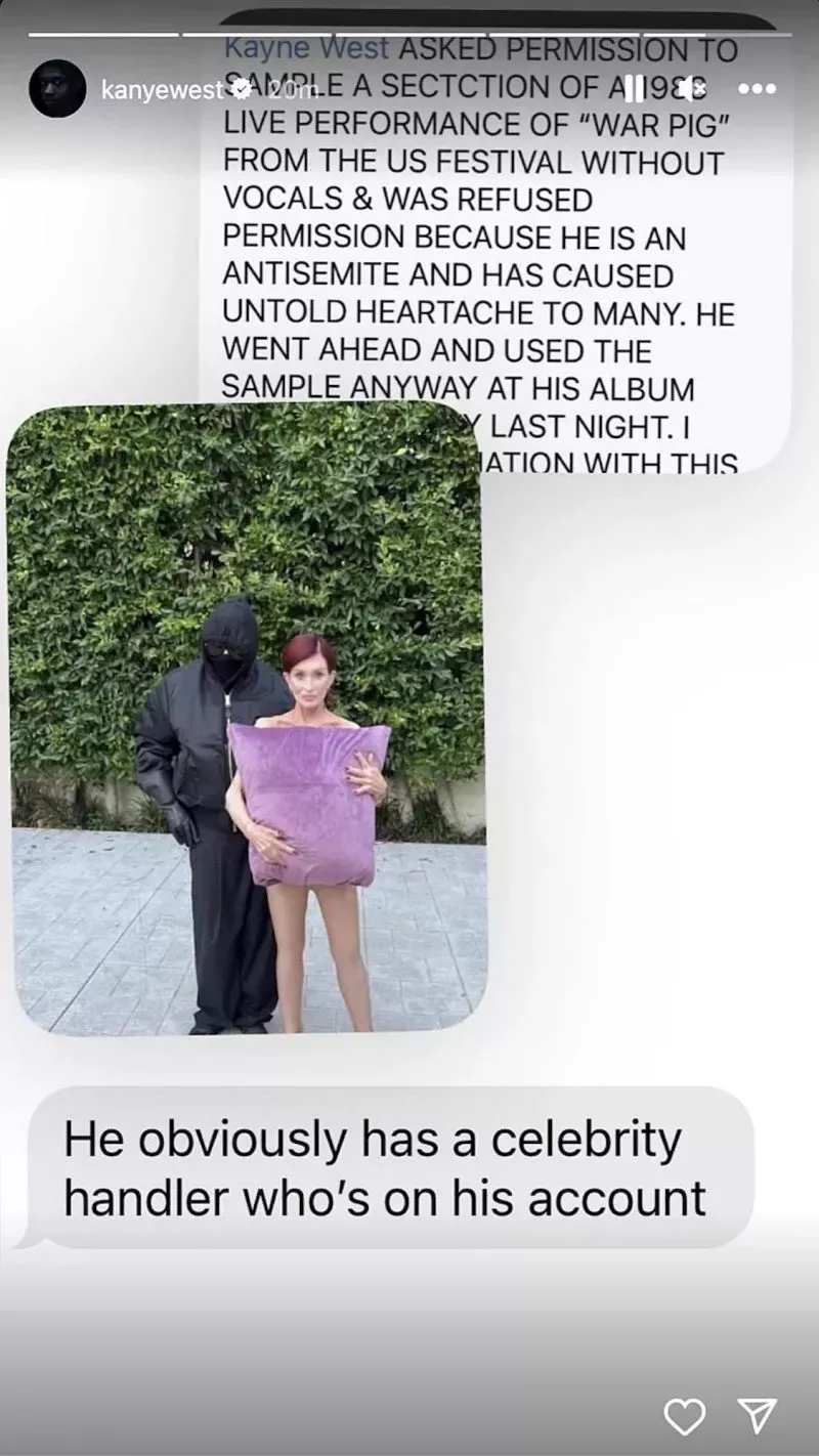 Ozzy escribió que West "pidió permiso para samplear una sección de una actuación en directo de 1983 de 'War Pigs' del festival estadounidense sin voces", pero posteriormente "se le denegó el permiso porque es un antisemita y ha causado un dolor de corazón incalculable a muchos". El post se modificó posteriormente para incluir la canción 'Iron Man'.