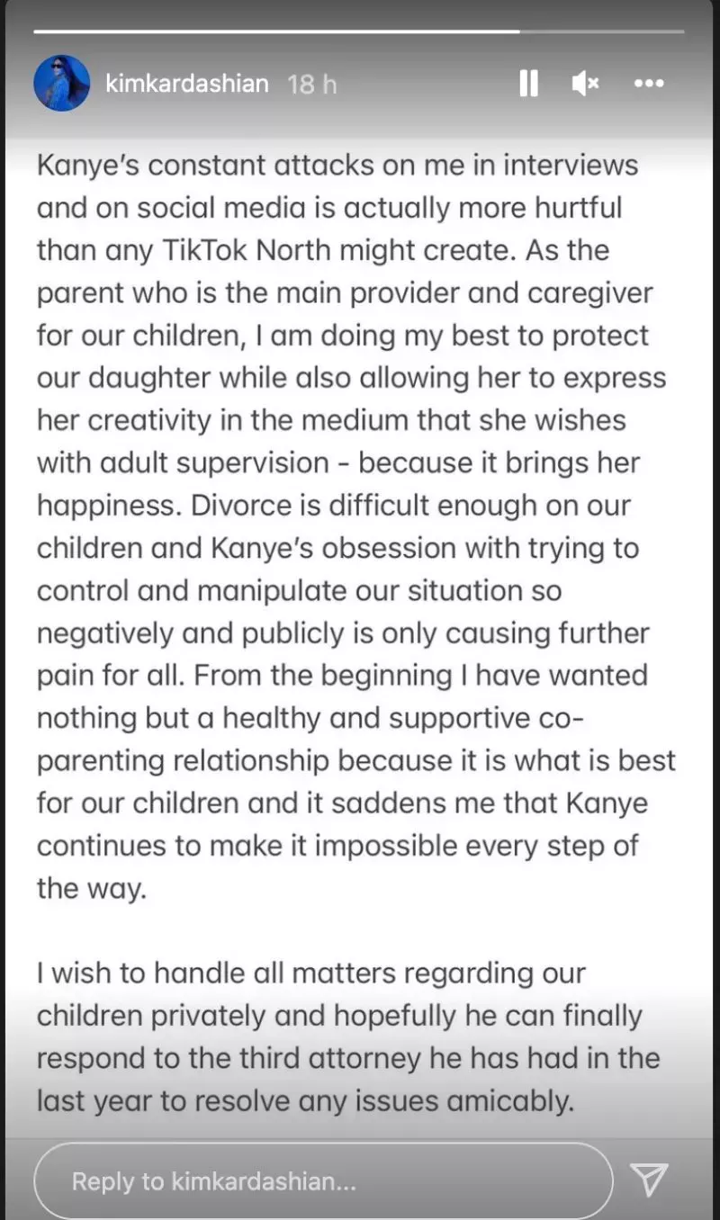 Kardashian respondió entonces, publicando una historia que decía: "Los constantes ataques de Kanye contra mí en las entrevistas y en las redes sociales son realmente más hirientes que cualquier TikTok que North pueda crear."