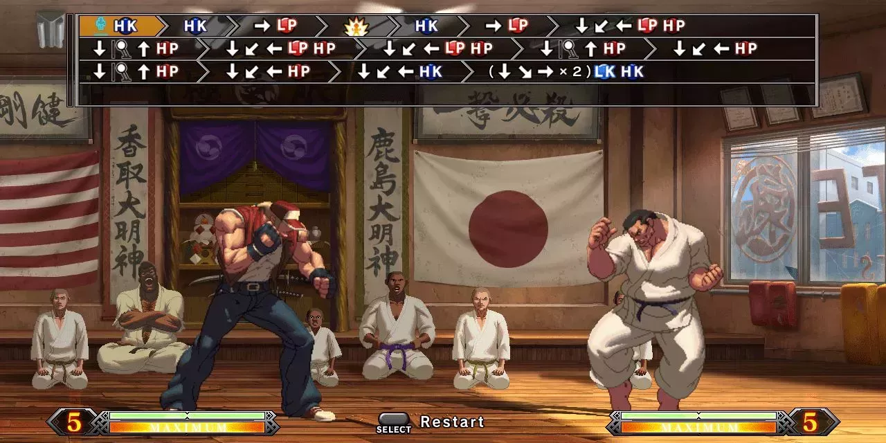 KOF también utiliza un movimiento único del joystick para los ataques especiales en forma de movimiento de pretzel (abajo-atrás, medio círculo atrás, abajo-adelante). Rara vez aparece, ya que se utiliza principalmente para el ataque Raging Storm de Geese Howard, pero es una entrada de alta ejecución que seguramente pondrá a prueba a cualquier fan de los juegos de lucha.