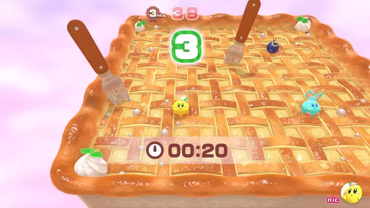 Pero el ambiente es mucho menos amenazante que el de un juego que está más abiertamente diseñado para permitirte fastidiar a tus adversarios por efecto cómico. Por un lado, Kirby puede flotar, por lo que caerse de los salientes durante las carreras es menos peligroso. Además, los potenciadores se regeneran rápidamente, y hay tantas fresas que caen del cielo que nunca parecen escasas. El final de cada carrera está marcado por tres pilas de tortitas decoradas con fresas, valoradas en 10, 30 y 50 fresas, por lo que llegar el primero te proporciona la mayor cantidad de bayas. Esta es la forma que tiene el juego de recompensar al primer, segundo y tercer puesto.