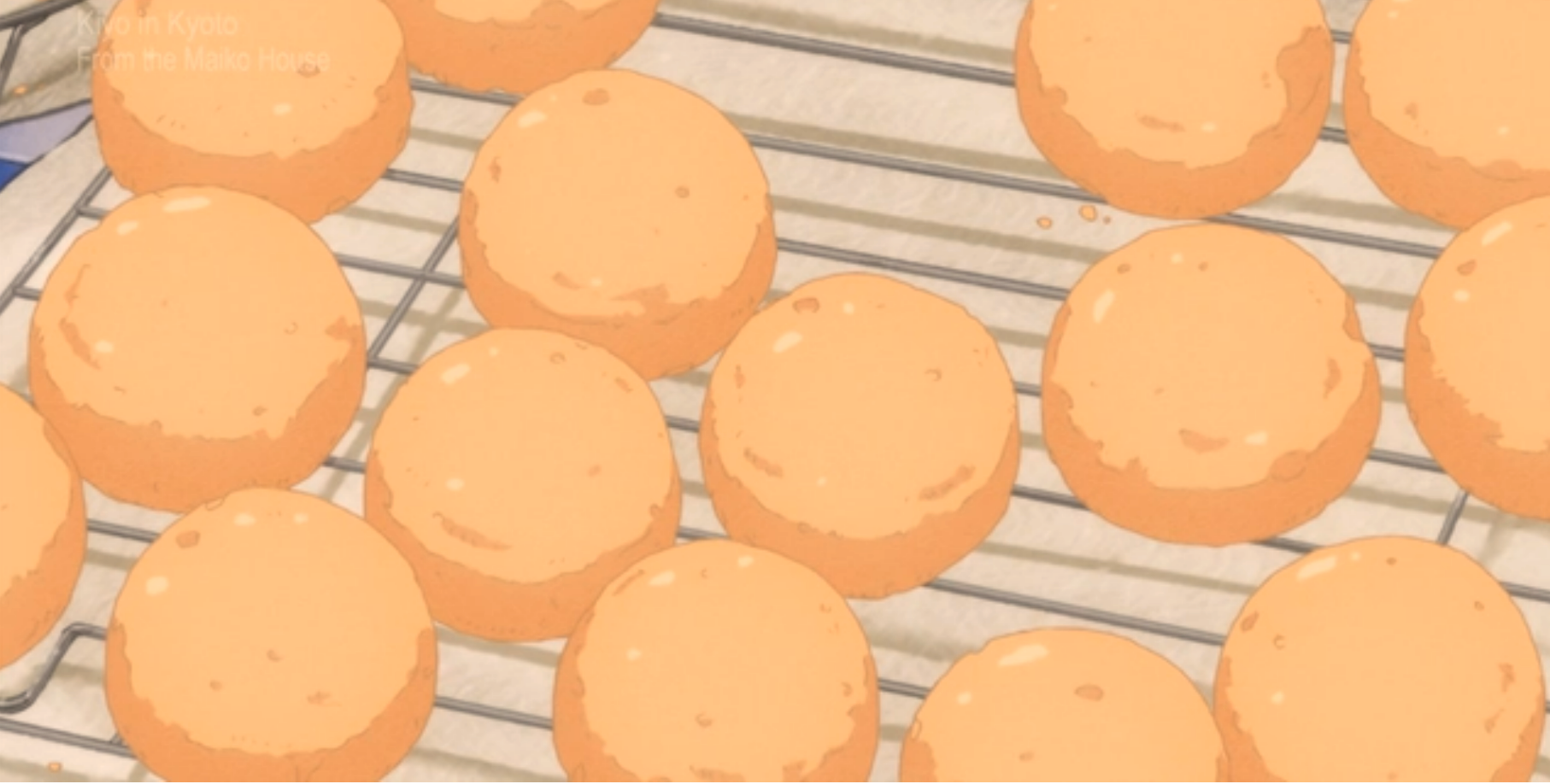 Por desgracia para Sumire, y para diversión de Kiyo, uno de los otros maikos de la casa acaba comiéndoselas todas tras tener un fuerte antojo de galletas. Estos productos horneados son fáciles de disfrutar por cualquier persona, joven o mayor.