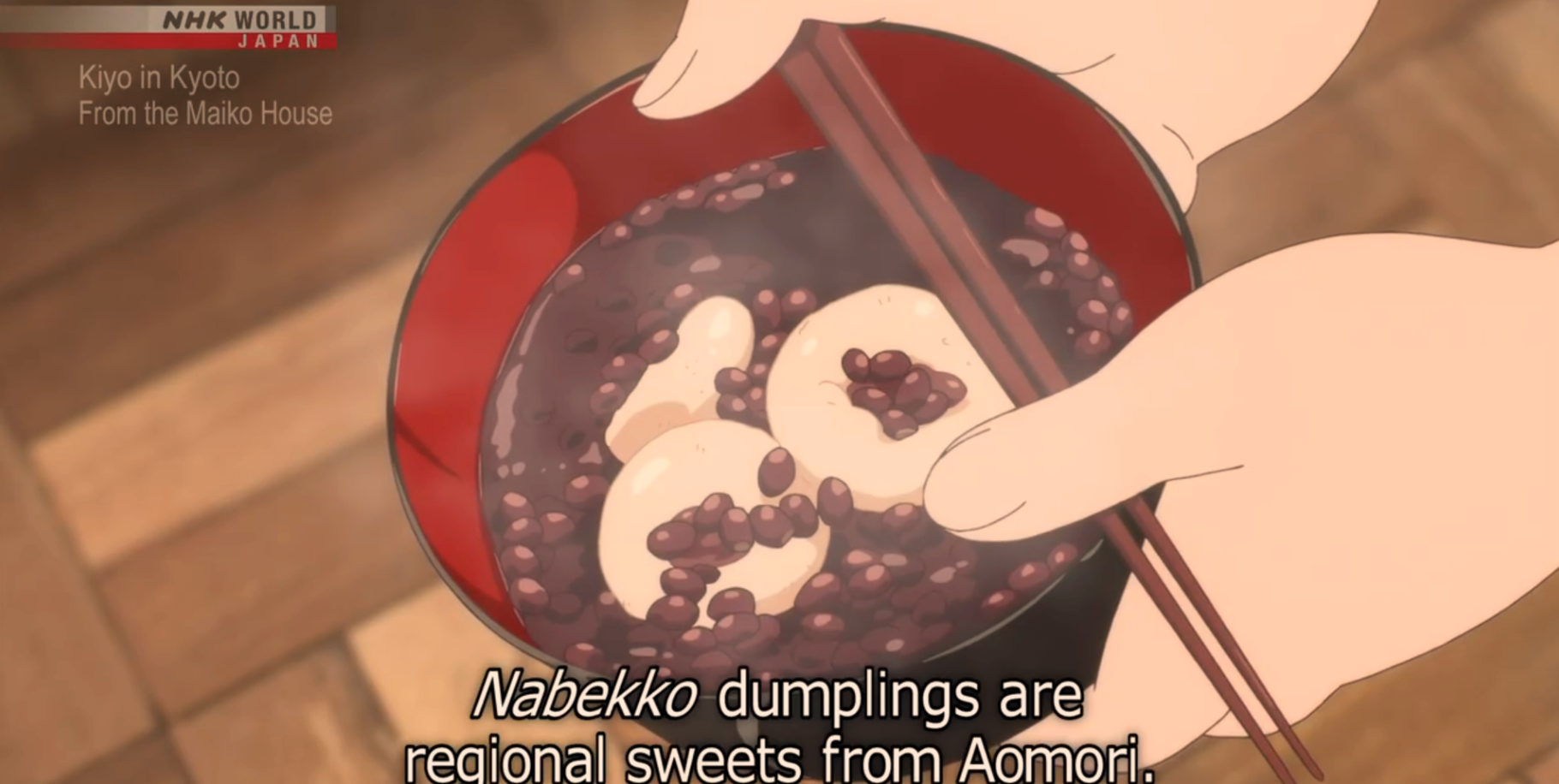 Las albóndigas de nabekko son dulces regionales de Aomori. Suelen comerse cuando la gente se reúne para celebrar una ocasión especial. Este plato en particular se comía cuando Sumire celebraba el día de su debut como maiko oficial. Este plato consiste en una sopa dulce de alubias rojas con pequeñas albóndigas de trigo.