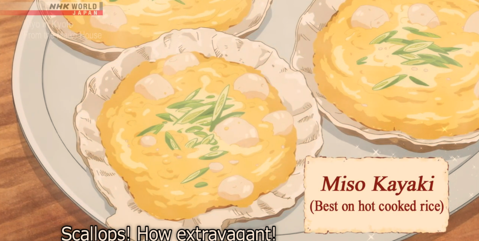 El Miso Kayaki, también conocido como vieiras al horno, fue uno de los últimos platos que Kiyo y Sumire comieron en casa antes de ir a la casa de las maiko para entrenar. El plato utiliza grandes conchas de vieira como recipientes para hornear. Hay varias recetas, pero la abuela de Kiyo utilizaba miso, cebollas galesas, vieiras y huevos.