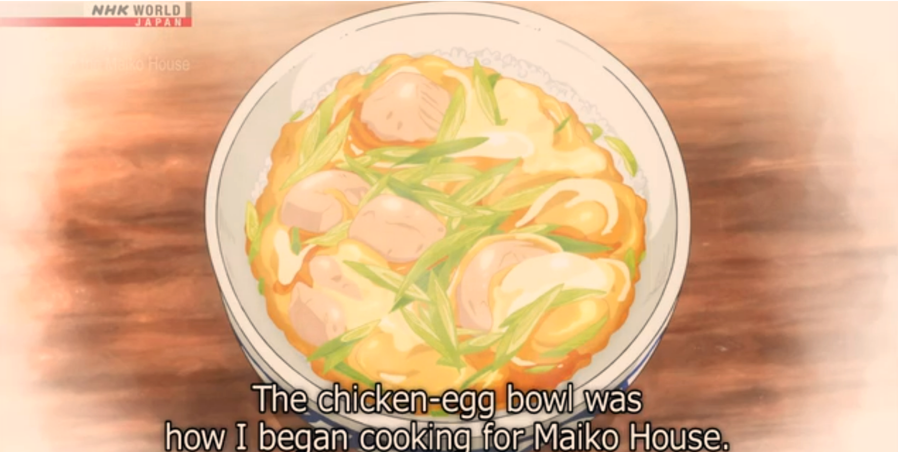 Después de que el anterior cocinero se lesionara y no pudiera trabajar, las maiko dependían de la comida para llevar. Sin embargo, cuando Kiyo se dio cuenta de que las otras maiko estaban hartas de la comida para llevar, decidió tomar cartas en el asunto y cocinar ella misma para ellas, empezando por el bol de pollo y huevo. El resultado fue que se convirtió en su cocinera permanente, para su gratitud y la alegría de Kiyo.